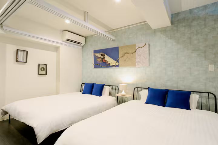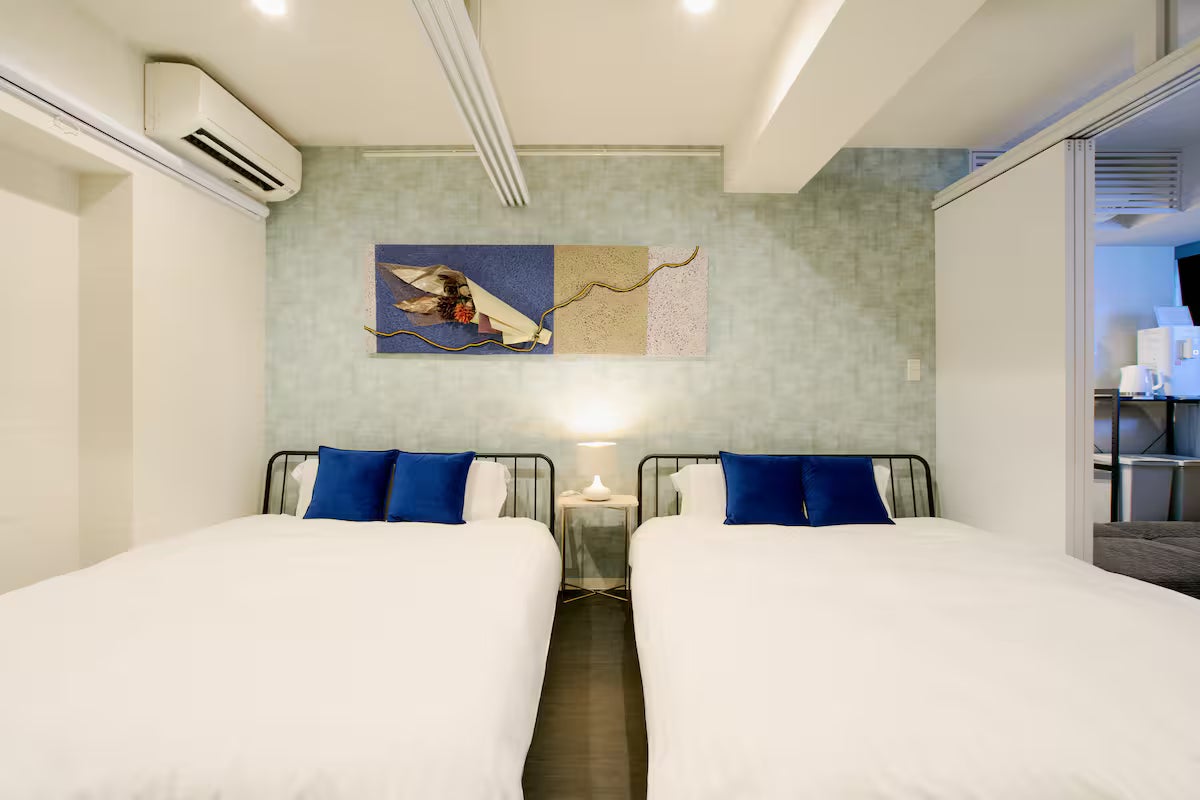 クイーンベッド2台、エアコン、シーツ類、遮光カーテン、予備の枕と毛布、Wi-Fi、暖房