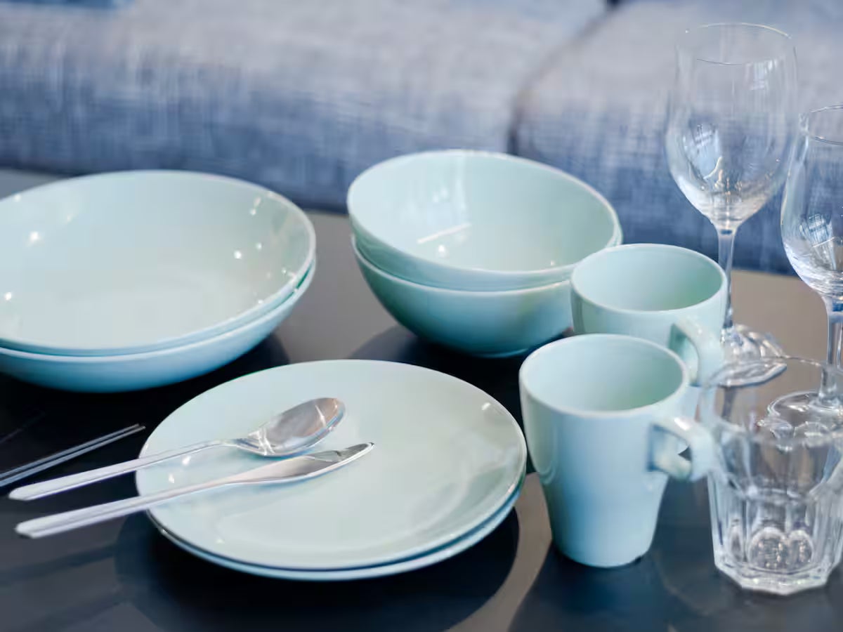 トースター、ワイングラス、冷蔵庫、冷凍庫、電子レンジ、電気ポット、食器&カトラリー、コンロ
