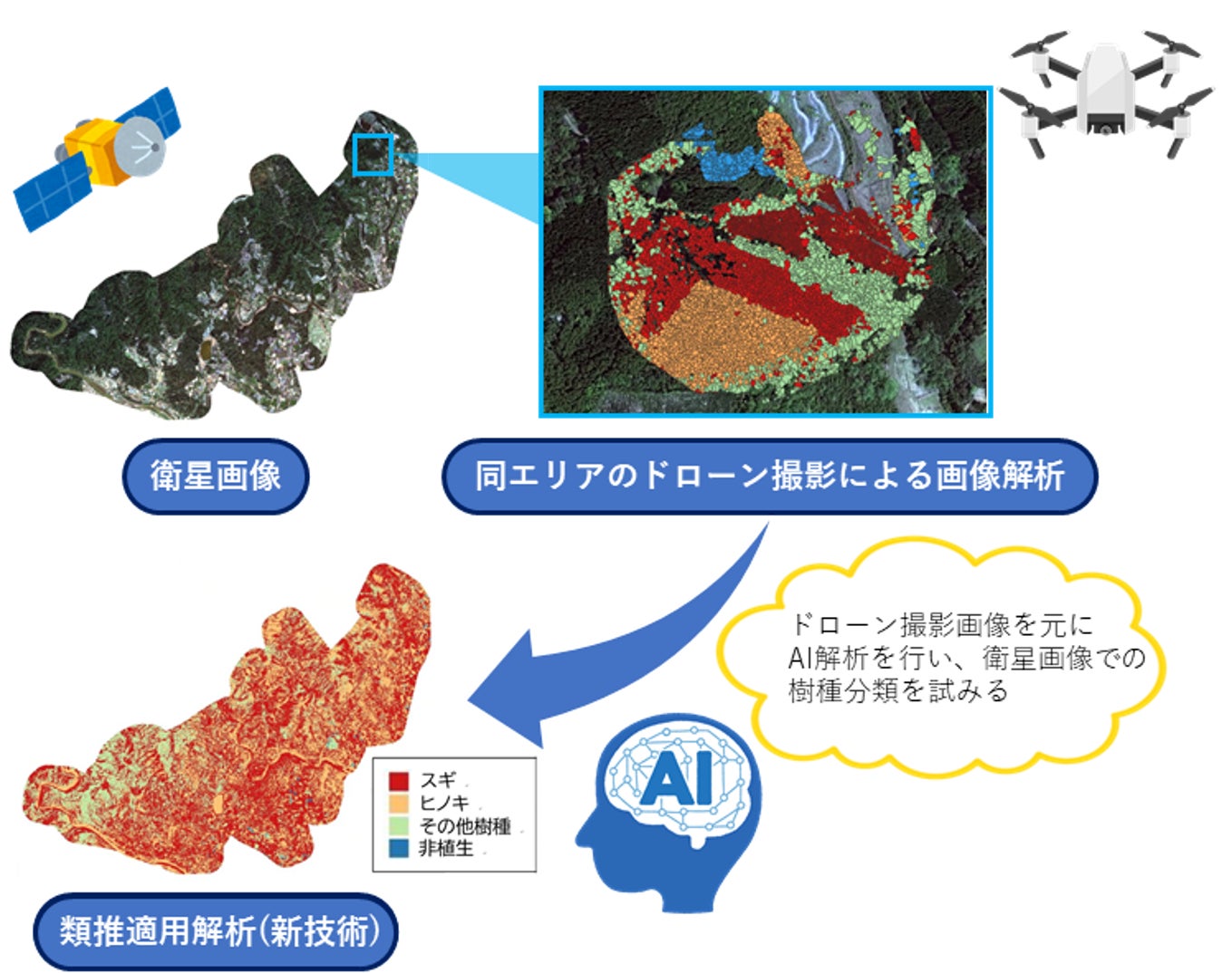 当社技術開発部とスカイマティクス社は、現在、プロジェクトとして『ドローン画像と衛星画像の類推適用解析による森林資源量解析』の研究開発を共同で実施しています。これは、当社 グループで運営している木質バイオマス発電所においてエネルギー資源となる森林樹木の賦存量を解析するものです。