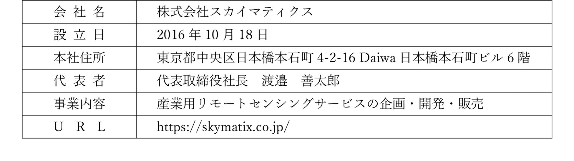 当社は、産業用リモートセンシングサービスを企画・開発・販売する株式会社スカイマティクス(本社:東京都中央区、代表取締役社長:渡邉善太郎、以下「スカイマティクス社」)と資本業務提携を行いましたので、お知らせいたします。