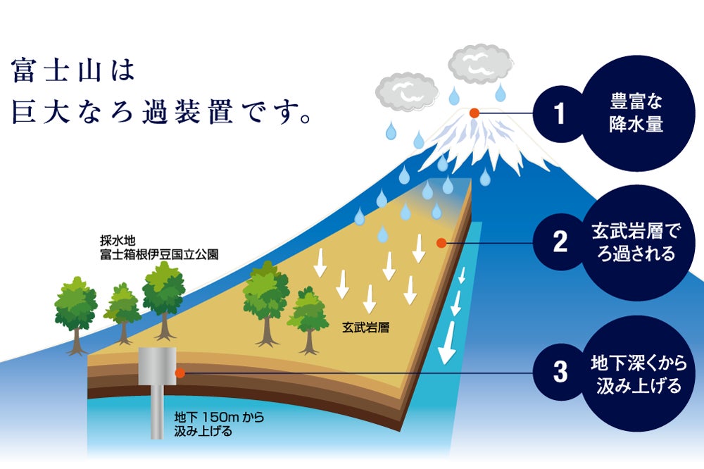 富士山の玄武岩層で自然ろ過された後、加熱処理で不純物のみを取り除くため、バナジウムやシリカなどの希少な天然ミネラルを豊富に含んでいます。