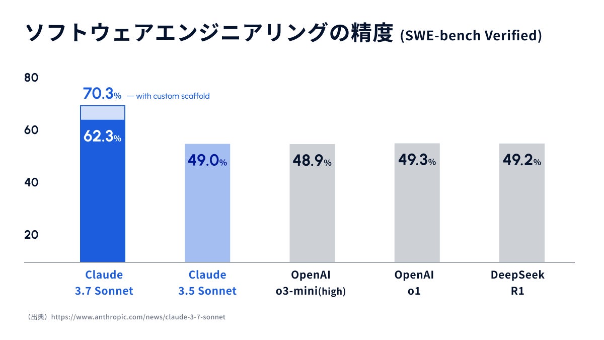 「Claude 3.7 Sonnet」は、従来から提供している「Claude 3.5 Sonnet」の上位互換モデルとなり、コーディングやWeb開発の性能が大幅に向上しています。「Claude 3.7 Sonnet」では、通常通りの回答を得る標準モードと、回答する前にAIモデル側で長く考えさせて回答を得る拡張思考モードが選択できます。拡張思考モードでは、回答する前にAIモデル側で思考することで、数学・物理学・コーディングなどのタスクでパフォーマンスが向上します。