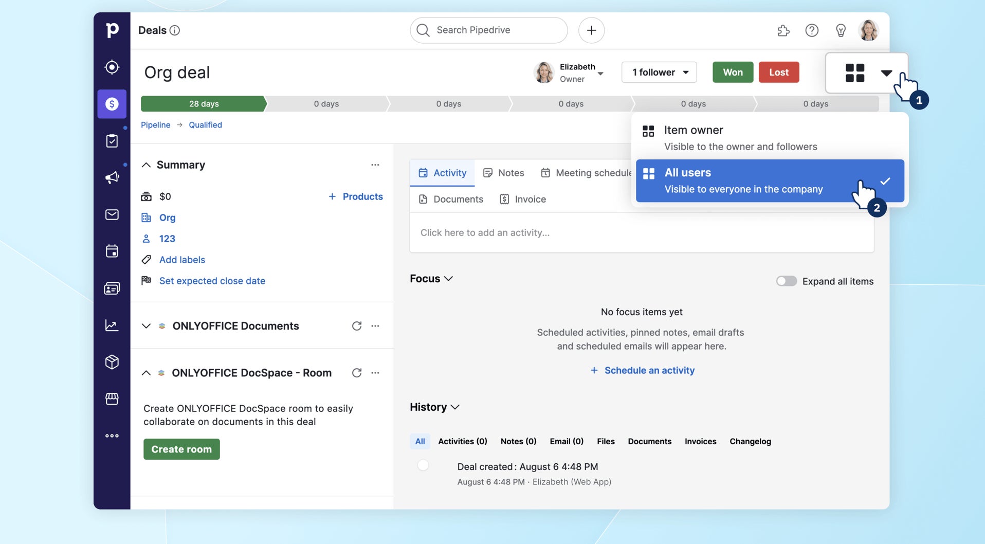 Pipedriveでユーザーが案件に追加または削除された場合、DocSpaceルームへのアクセスレベルは自動的に更新され、ドキュメントの権限は現在の案件参加者と同期されます。