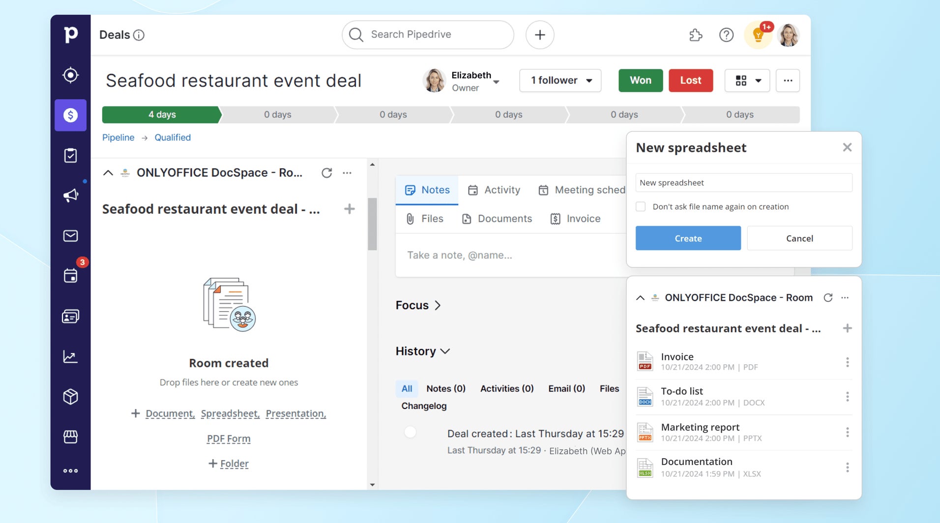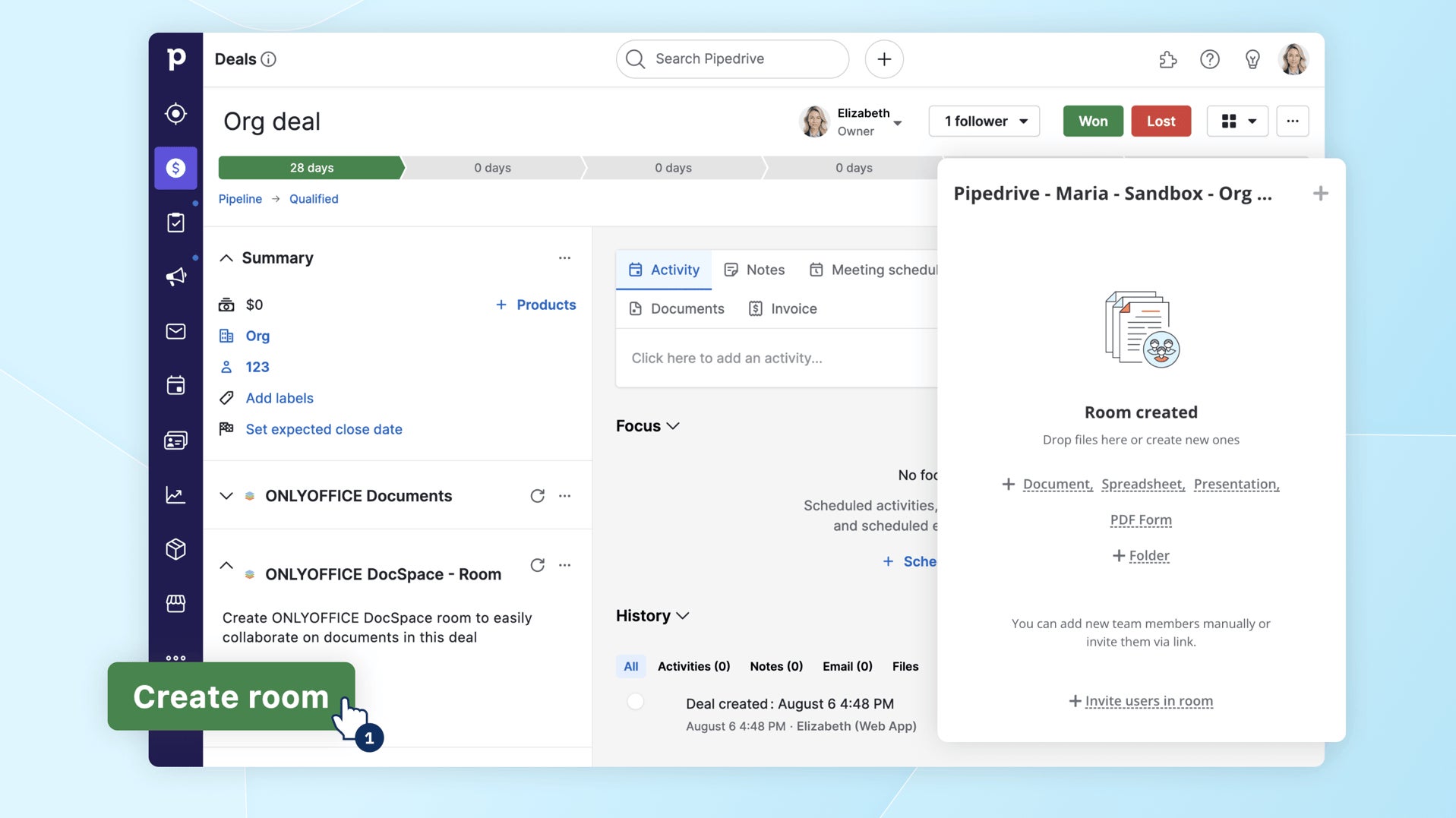 ユーザーは、Pipedriveの案件から直接、ドキュメントの共同作業用のDocSpace専用ルームを作成できます。各ルームは、Pipedrive – 会社名 – 案件名というルールに従って自動的に名前が付けられます。