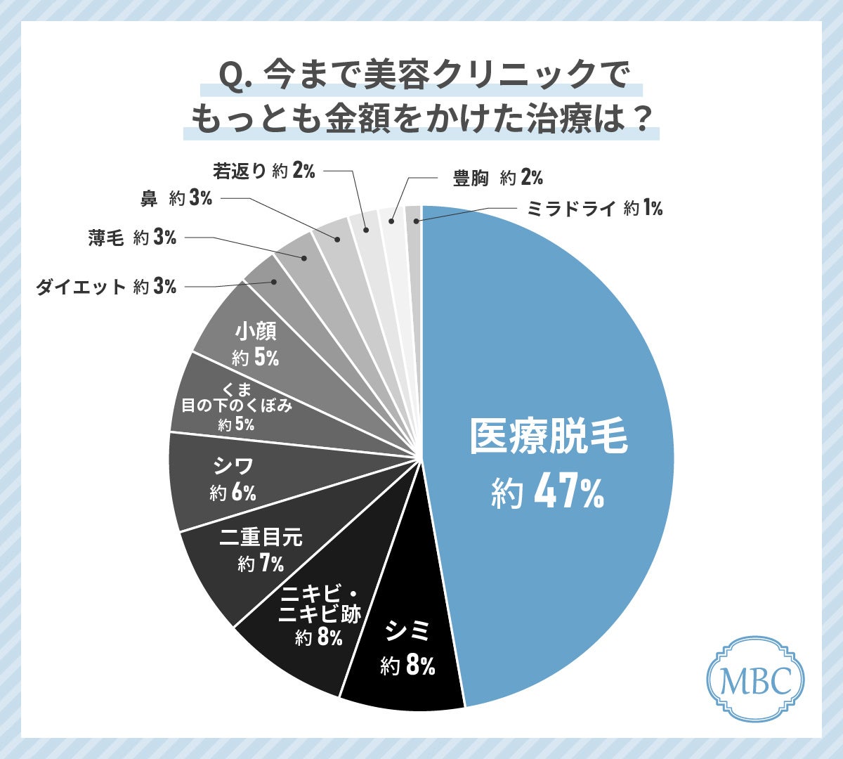 また、初めて美容クリニックに行くきっかけも「医療脱毛」が半数程度あり、もっとも金額をかけた治療も「医療脱毛」が非常に多いことが分かりました。