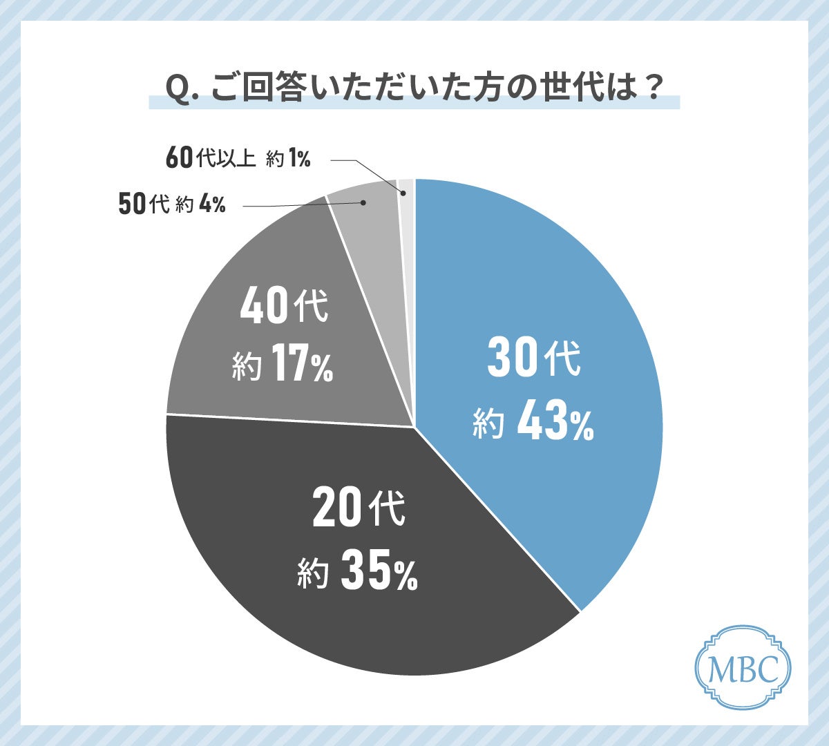 「回答者の年齢をお答えください」とアンケート調査した結果、30代(43%)、20代(35%)、40代(17%)、50代(4%)、60代(1%)でした。