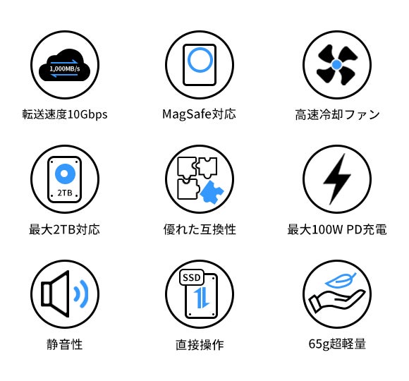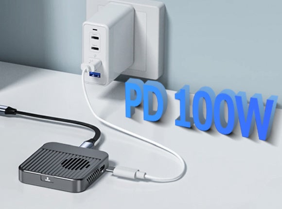 さらに、USB PD充電ポートも搭載されており、SSDの使用とともにPCやスマホ、タブレットに最大100Wの急速充電ができます。