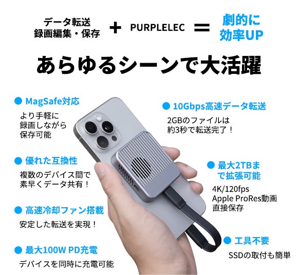 【新商品】冷却ファン搭載!充電しながら高速転送可能な多機能ミニ外付けSSDケース「PURPLELEC」