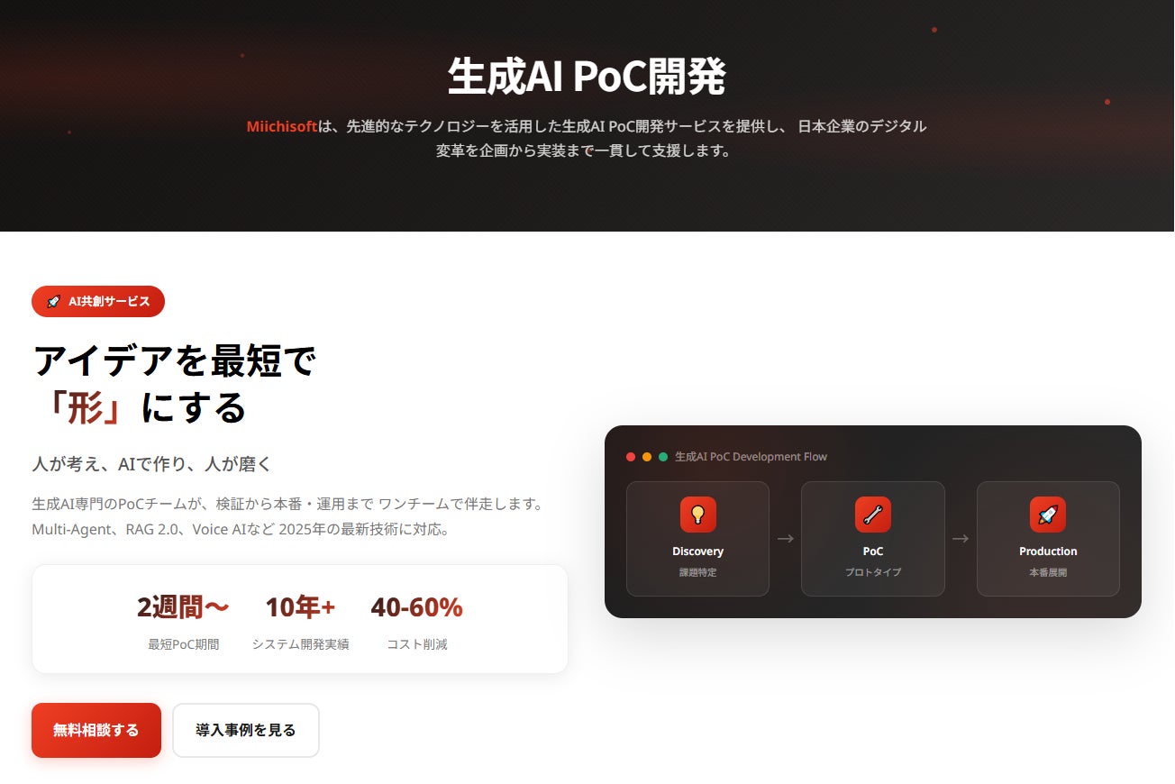 2026年1月28日、Miichisoftは生成AI PoC開発サービスの提供を正式に開始しました。本サービスは、生成AIの導入を検討しているものの、専門人材の不足、アイデアの実現可能性検証の困難さ、迅速かつ合理的なコストでの展開ニーズといった課題を抱える企業を対象としています。