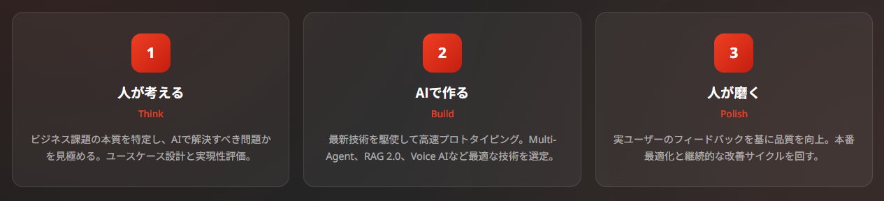 本サービスの差別化要因は、「私たちが考え、AIが構築し、私たちが完成させる」というアプローチにあります。