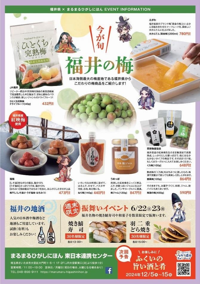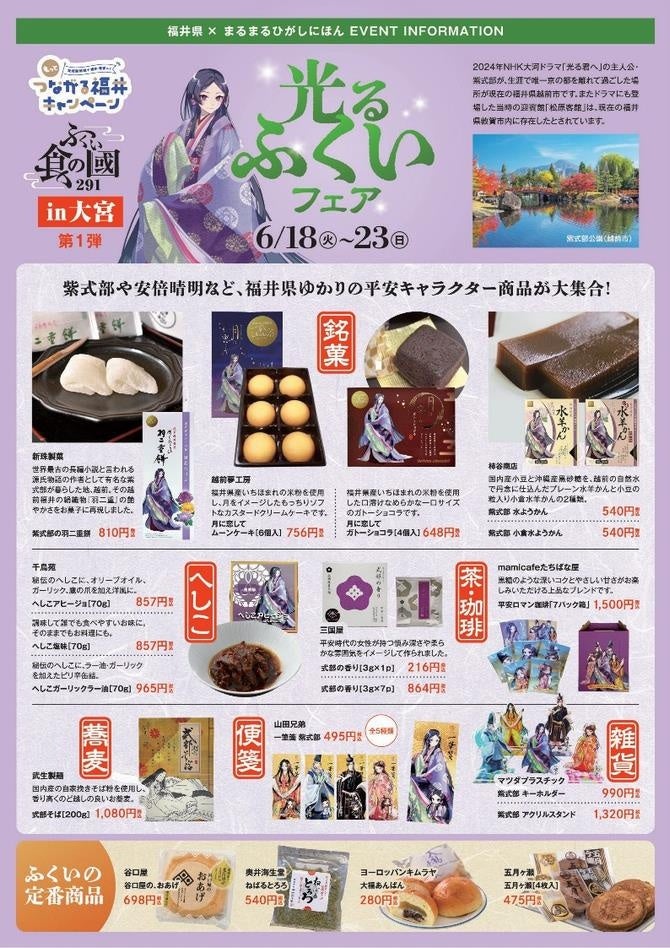 東⽇本の「ヒト・モノ・情報」が⼤宮に集合!⼤宮駅東⼝から徒歩1分のところにある、交流・発信・活性化を促す地⽅創⽣の場「まるまるひがしにほん(東⽇本連携センター)」で「光るふくいフェア」を開催します!6⽉18日(火)から6⽉23⽇(⽇)までの6⽇間限定イベントです。2024年NHK大河ドラマ「光る君へ」の主人公・紫式部や安倍晴明など、福井県ゆかりの平安キャラクター商品を販売します。そのほか、今が旬の福井の梅商品や人気の日本酒などの地酒も販売します。6月22日(土)と23日(日)には、福井名物の焼き鯖寿司や和菓子を数量限定(各30名様限定)で無料配布します。