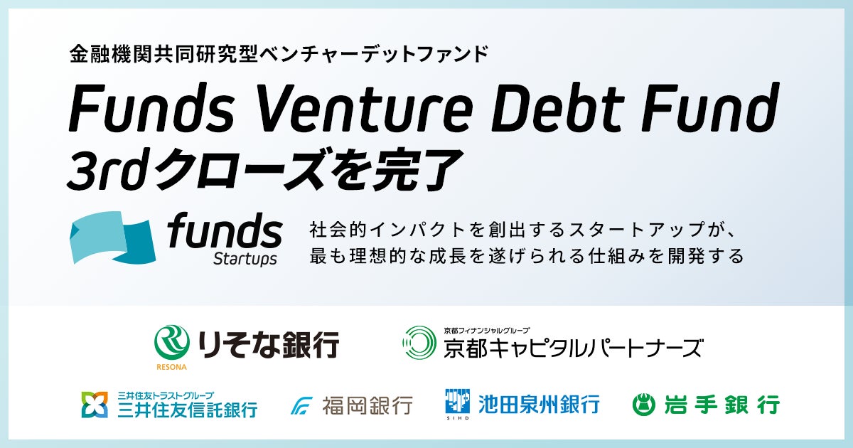 Funds Startups株式会社(本社:東京都渋谷区、代表取締役:前川寛洋)は、ミドル・レイターステージのスタートアップを投資対象とした金融機関共同研究型ベンチャーデットファンドである「Funds Venture Debt Fund 1号投資事業有限責任組合」(以下 本ファンド)に新たに株式会社りそな銀行・京都キャピタルパートナーズ株式会社が参画、本ファンドの目標額を達成し、3rdクローズを完了したことをお知らせいたします。