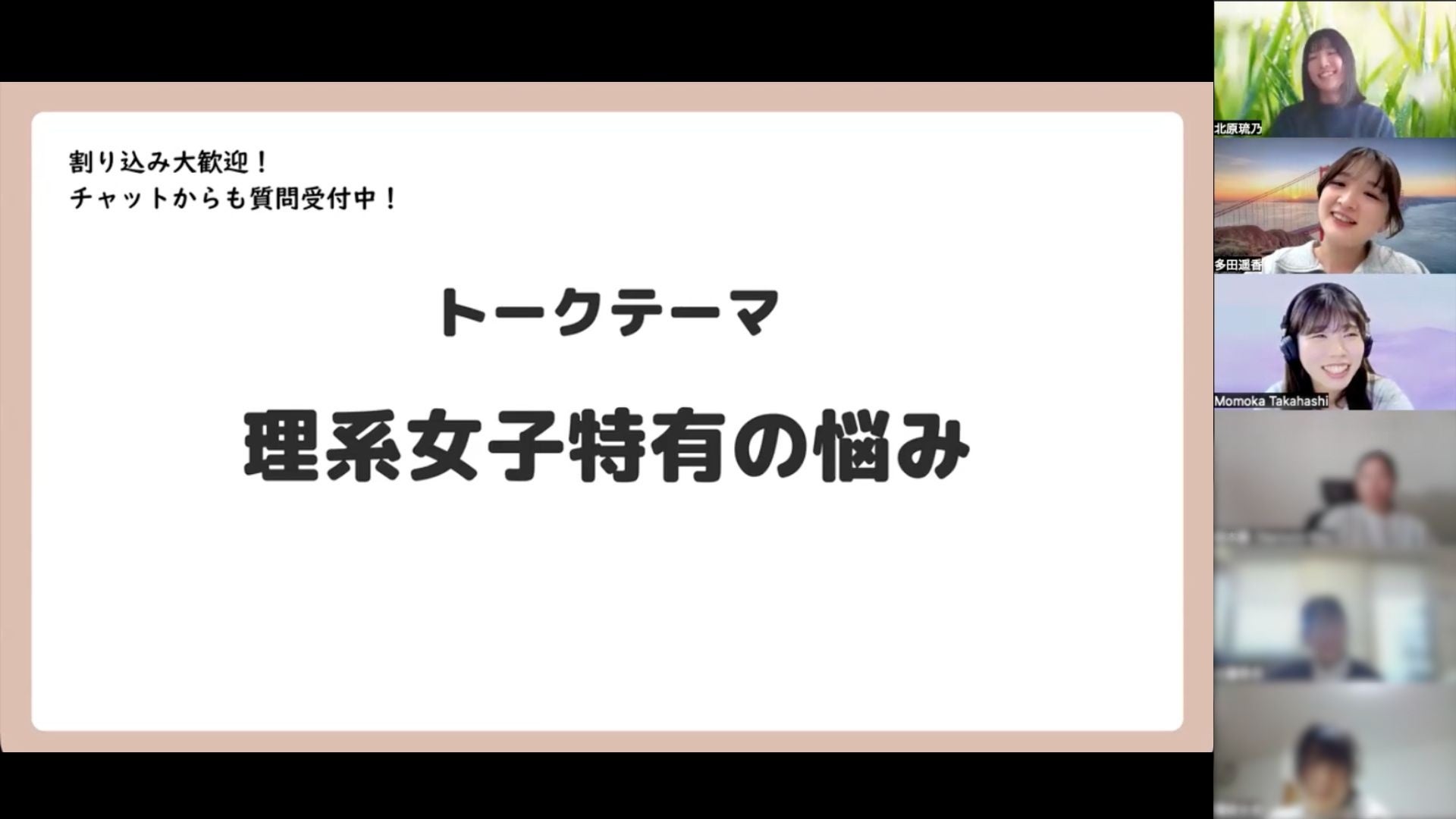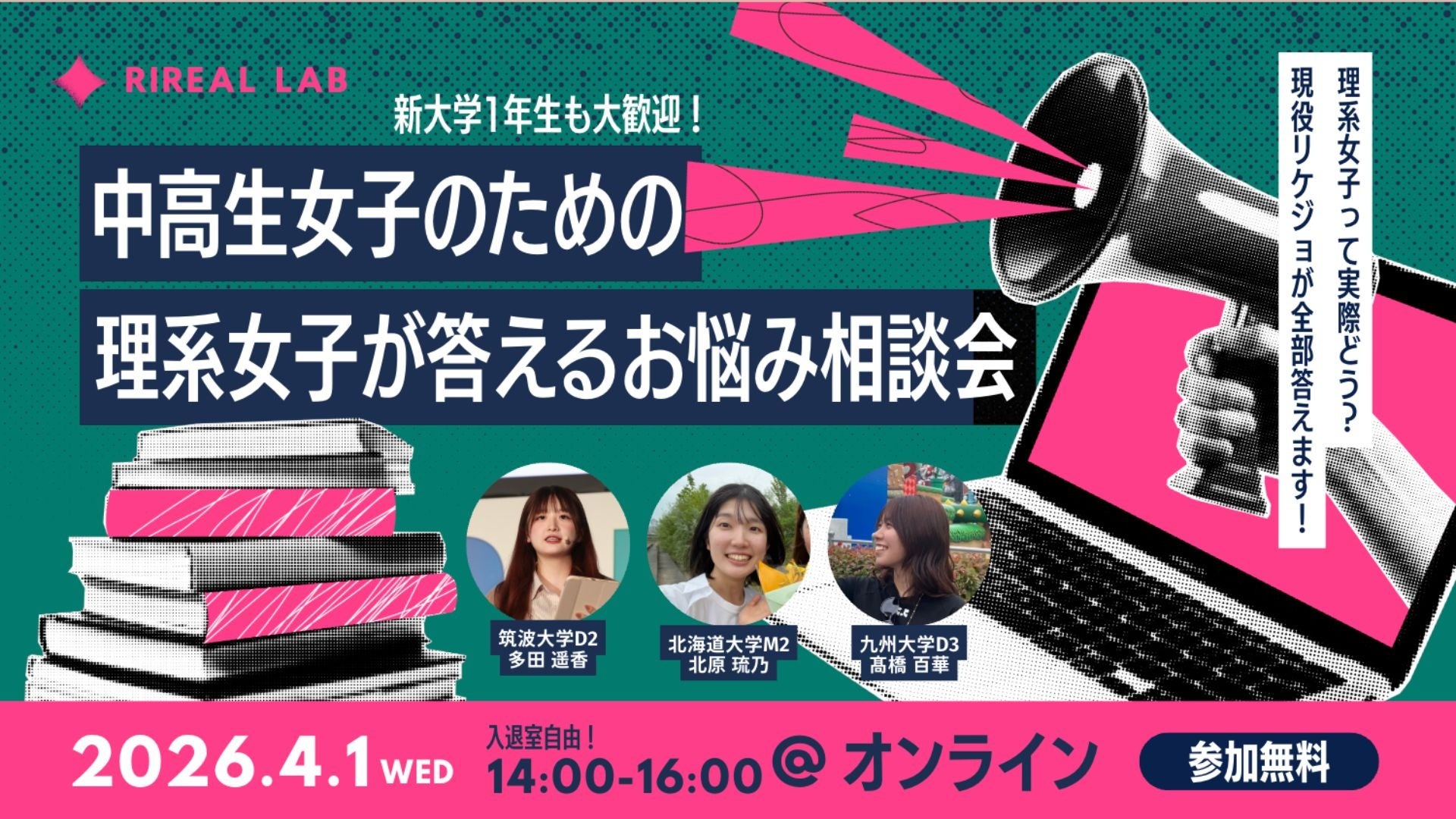2026年4月1日に実施した第1回イベントには、中学生から大学生まで幅広い参加者が集まり、「理系進学のリアル」や「女性ならではの悩み」について、現役の理系女子が直接相談に応じました。