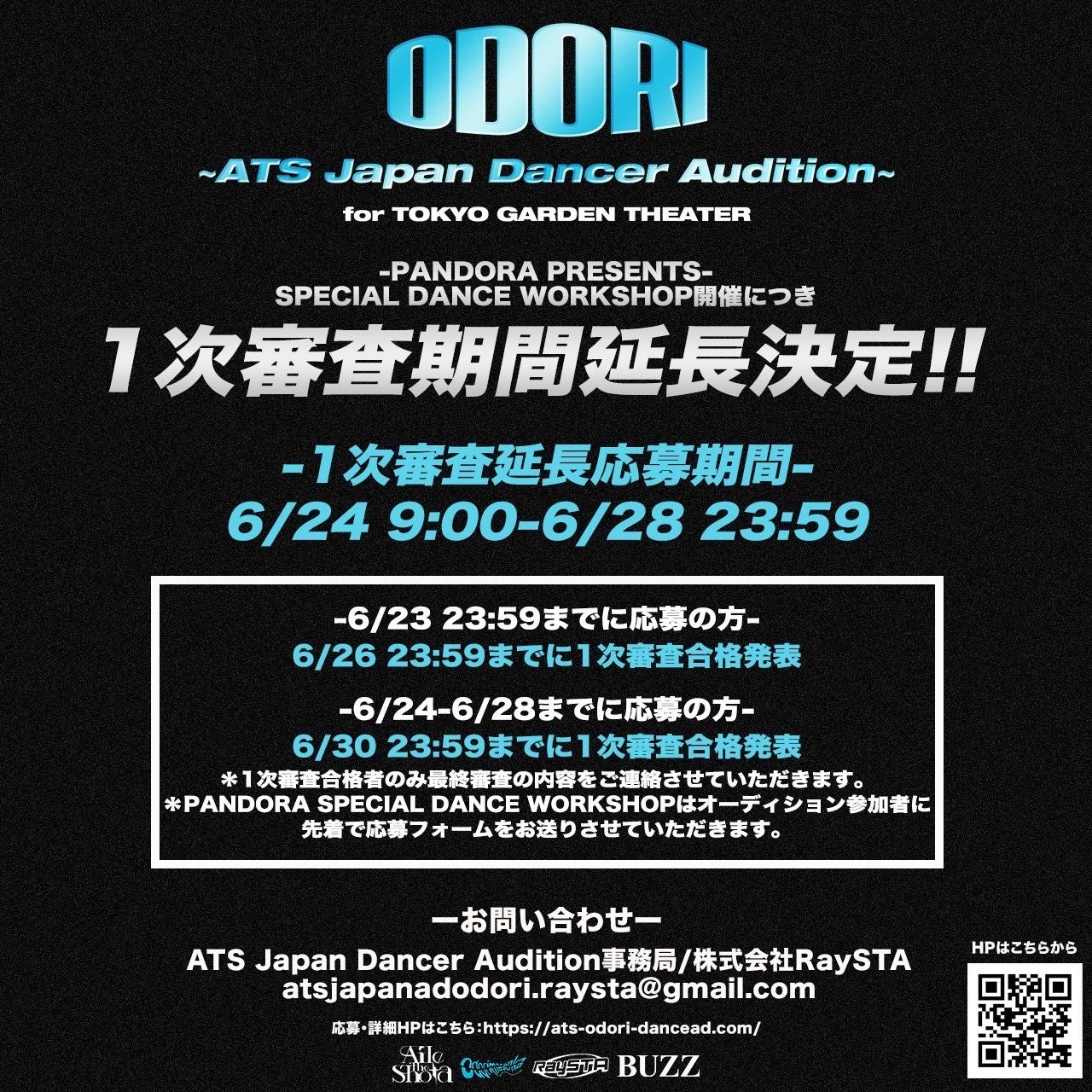 -PANDORA PRESENTS- SPECIAL DANCE WORKSHOPの開催に伴い、アーティストAile The Shotaの東京ガーデンシアター公演に出演するダンサーオーディション企画である「ODORI~ATS Japan Dancer Audition~for TOKYO GARDEN THEATER」の1次審査期間の延長も決定されました。