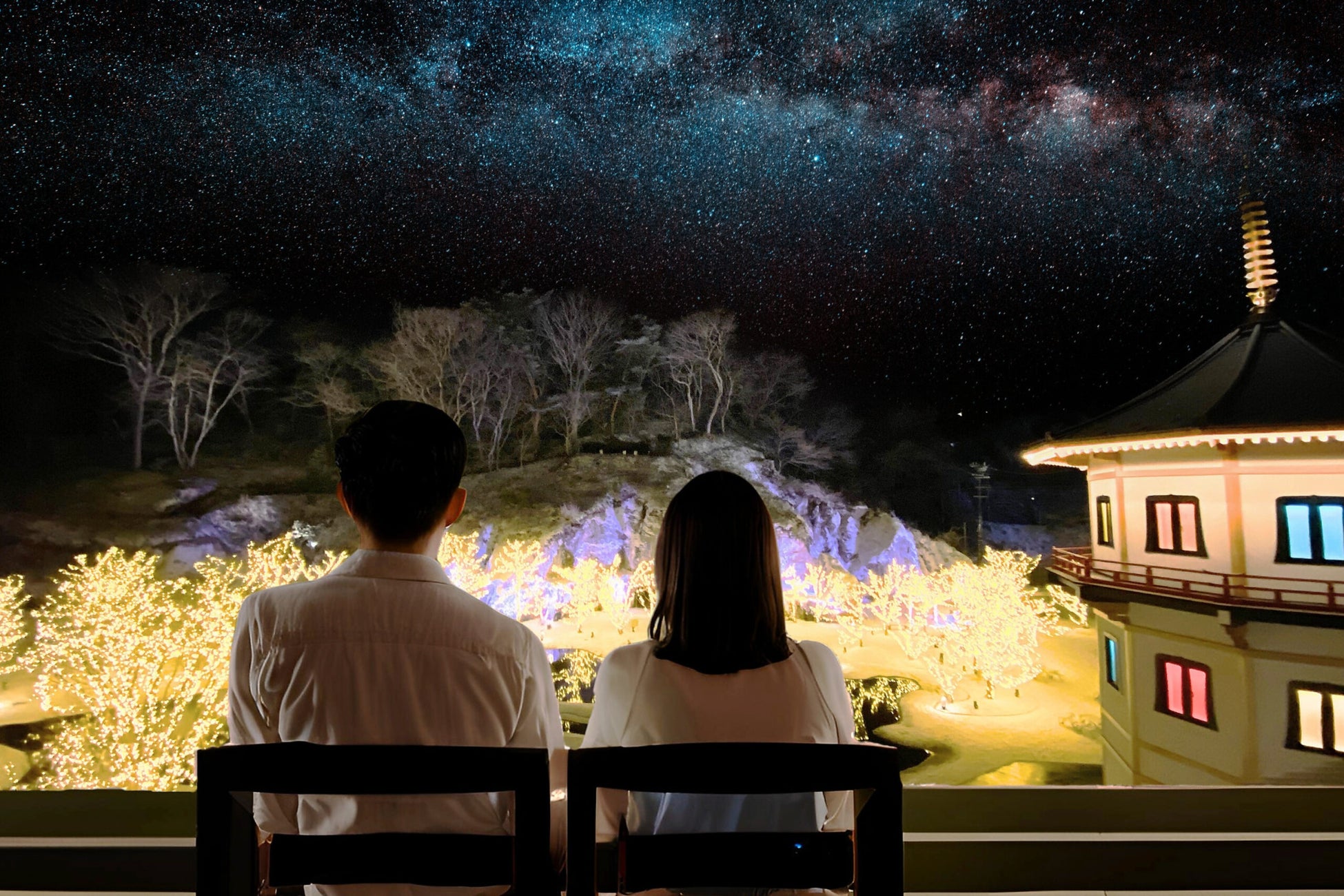 16万球の光が庭園の水盤に映り込む圧巻の景色を、一番高い場所から一望できる特等席。静寂に包まれながら、移ろう光のすべてを見渡す贅沢な時間をお過ごしください。