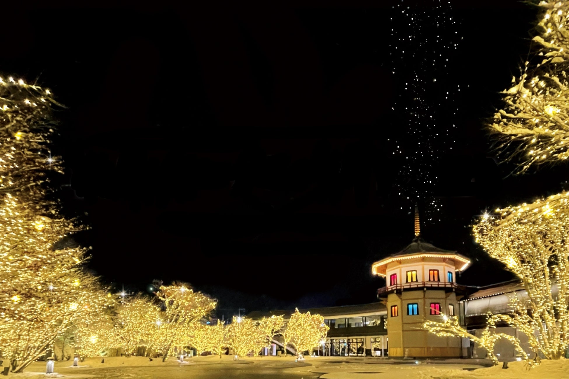 今年は開業以来初めて、宮城県松島離宮のシンボル「レツルタワー」がクリスマスカラーに染まる「クリスマス特別点灯」や、「光の雪」が舞う新演出と全長10mのイルミネーションで飾られた「光と雪のアーチ」、新スポットの青を基調にした"冬のきらめき"をまとった「和傘のライトアップ」など見どころも盛りだくさんです。