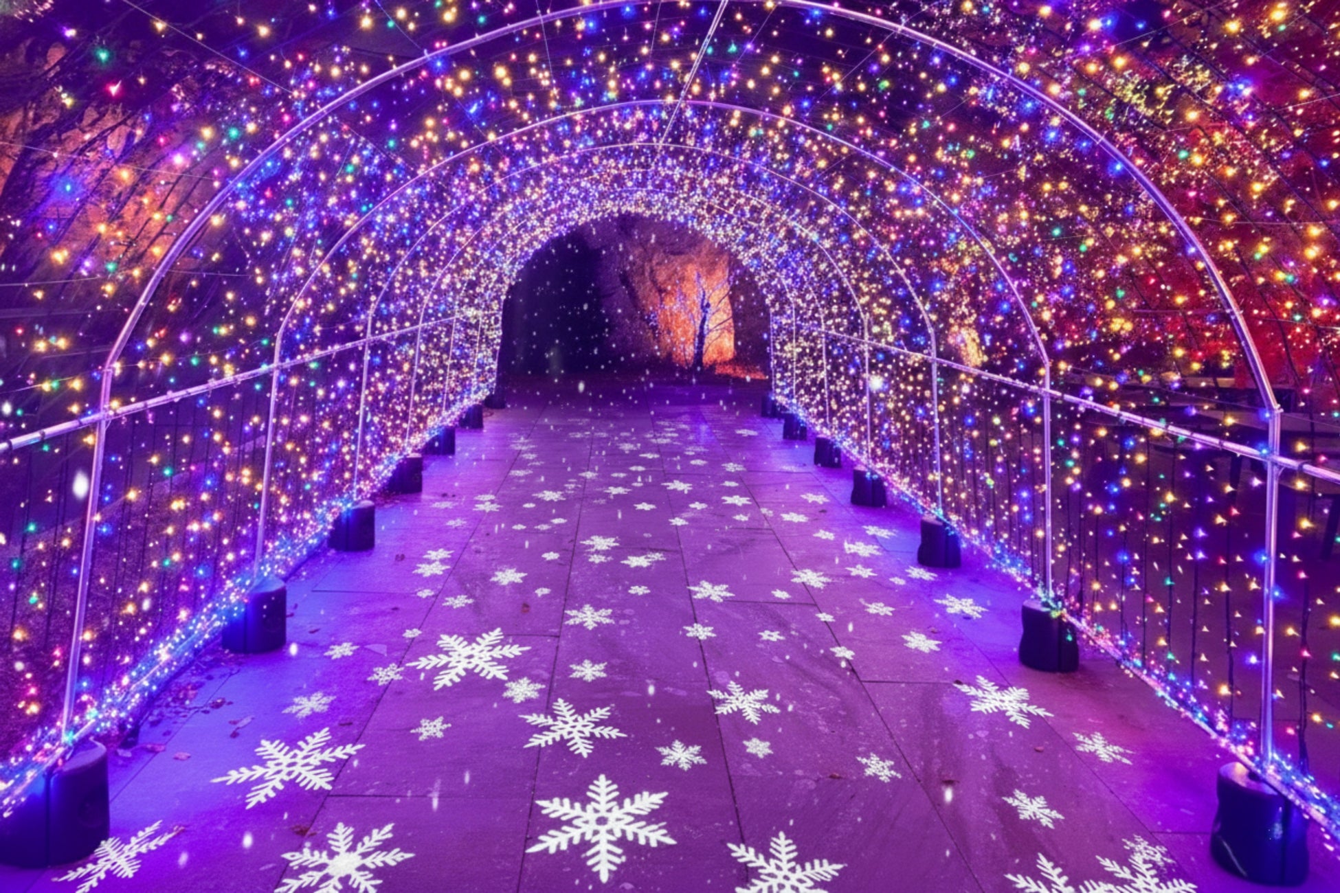 全長10mのイルミネーションアーチが新登場。 一歩足を踏み入れると、足元にはプロジェクターが映し出す無数の「雪の結晶」がきらめきます。 まるで光の雪が舞うトンネルが皆様を幻想の世界へと誘う、絶好のフォトスポットです。