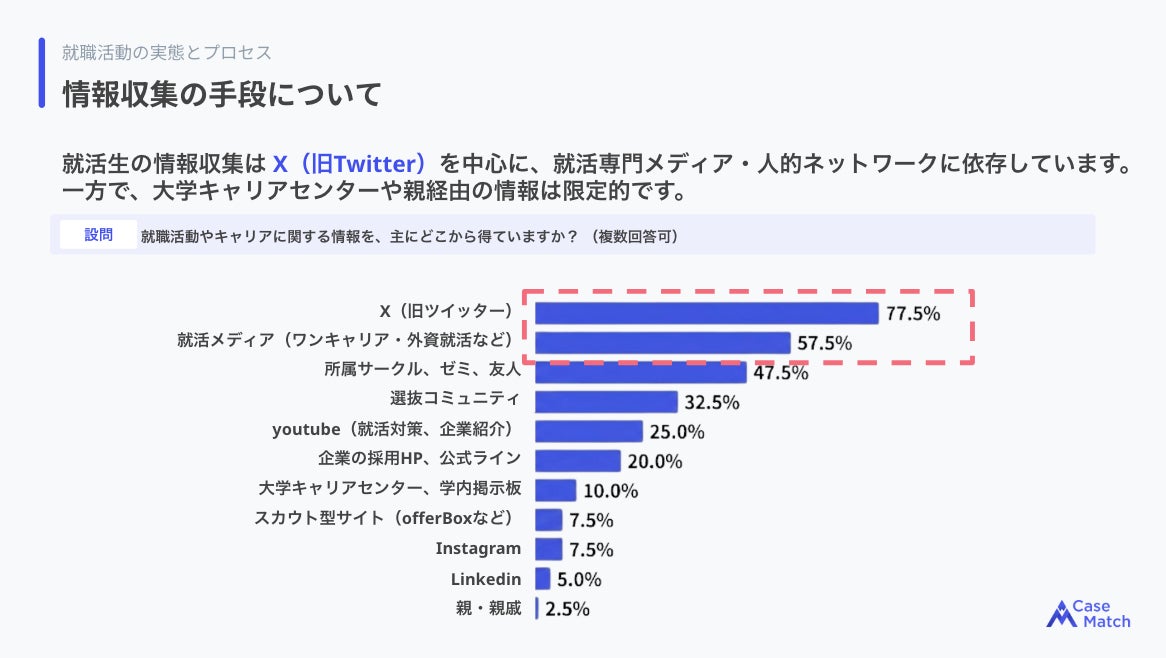 そのような状況を踏まえ、当社が提供するAI面接プラットフォーム「CaseMatch」の学生を対象に、上位校40名を対象に就活状況調査を実施。本レポートでは学生が企業に求めている情報や企業選びで重要視していることについて分析しています。