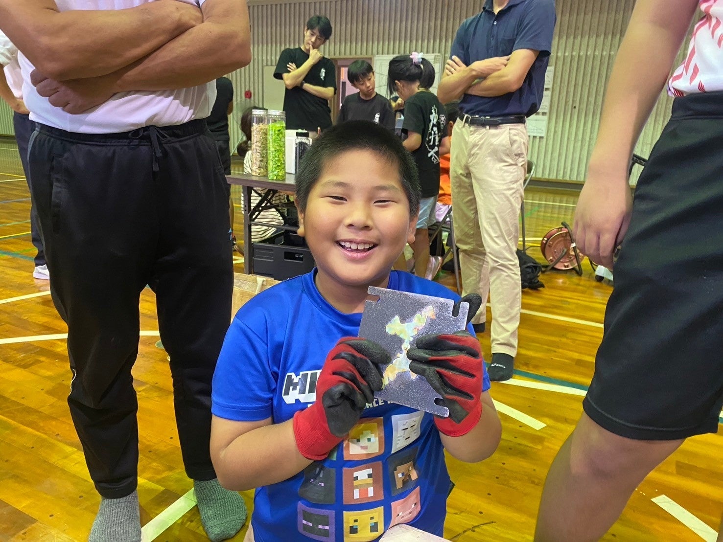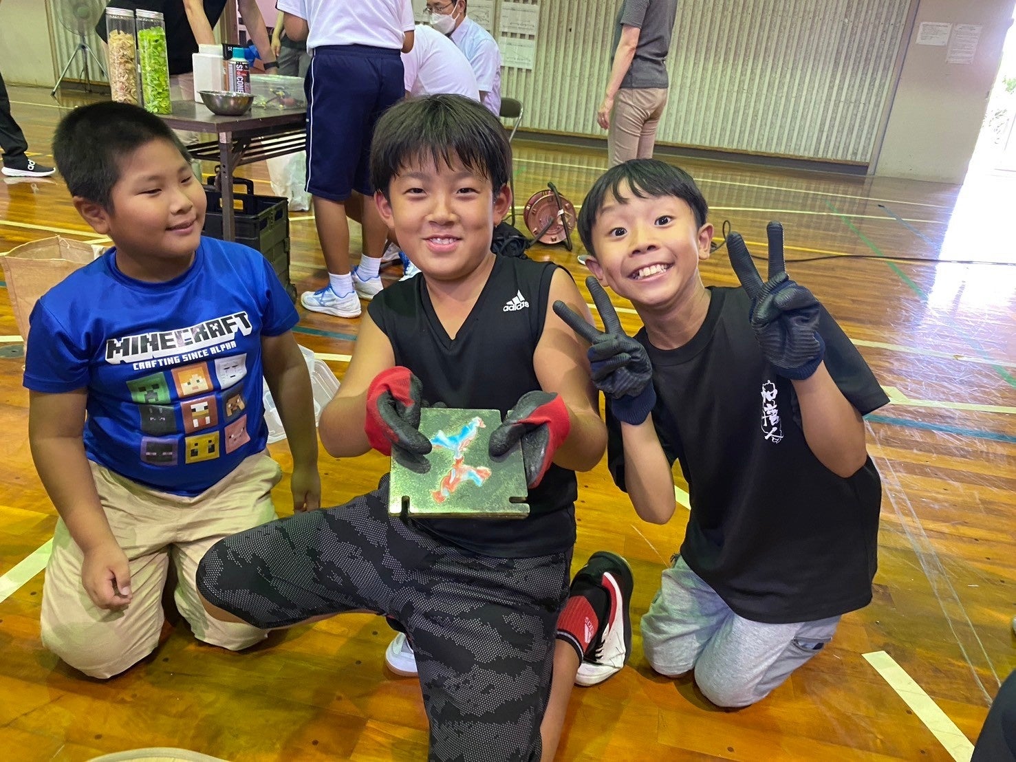 今回のアップサイクルワークショップでは、ビーチクリーンで回収したペットボトルキャップを使用し、加唐島の形を模したオリジナルキーホルダーを制作しました。このアイデアは子どもたち自身が考案したものであり、彼らが自分たちの地域に対する愛着や誇りを深める素晴らしい機会となりました。特に、加唐島に住み、学校に通っている生徒たちは、完成したキーホルダーを手にし、誇らしげな笑顔を見せていました。