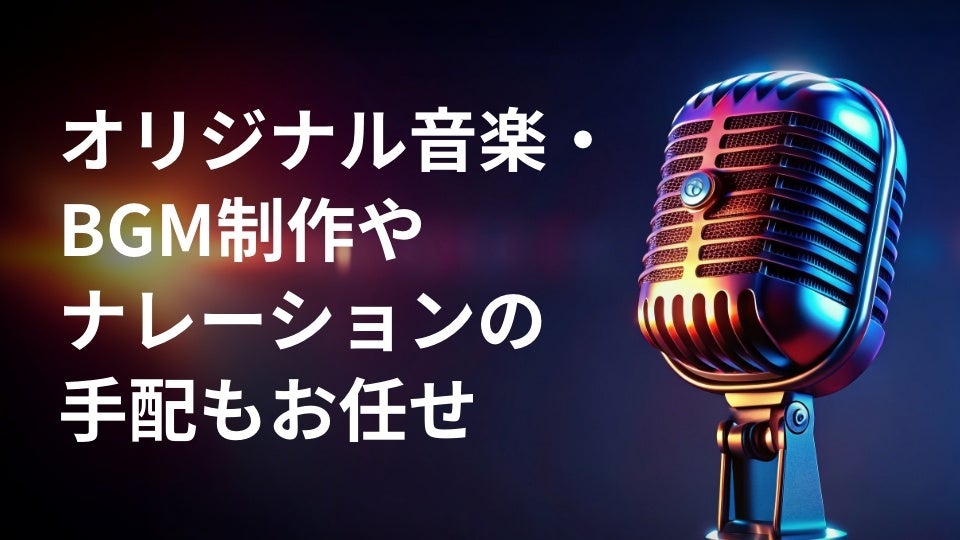 印象に残るオリジナル音楽・BGMの制作や、ナレータの手配・ナレーション収録にも対応可能です。テンポ感やブランドトーンに合わせた音設計で、動画の完成度をさらに引き上げます。