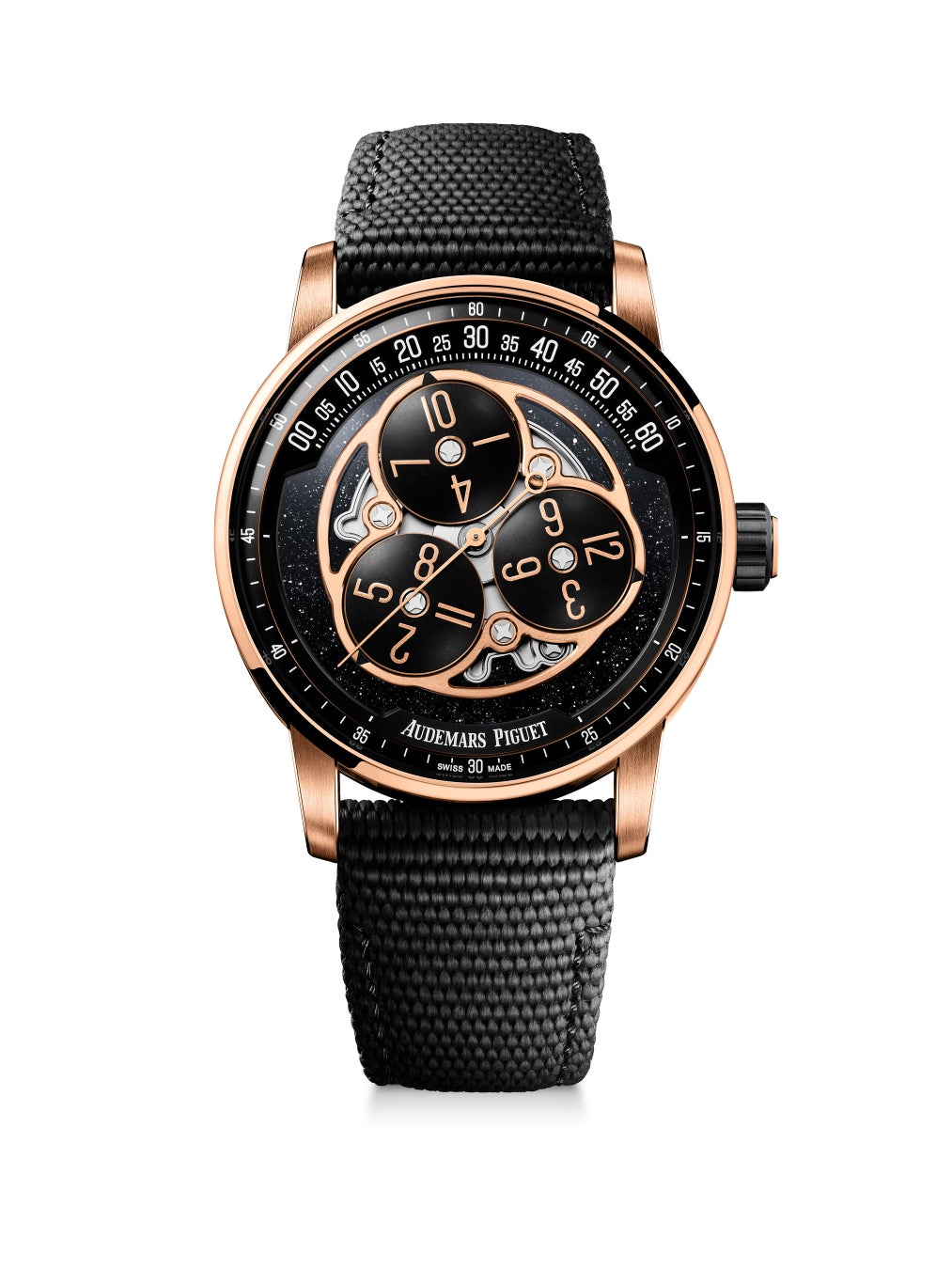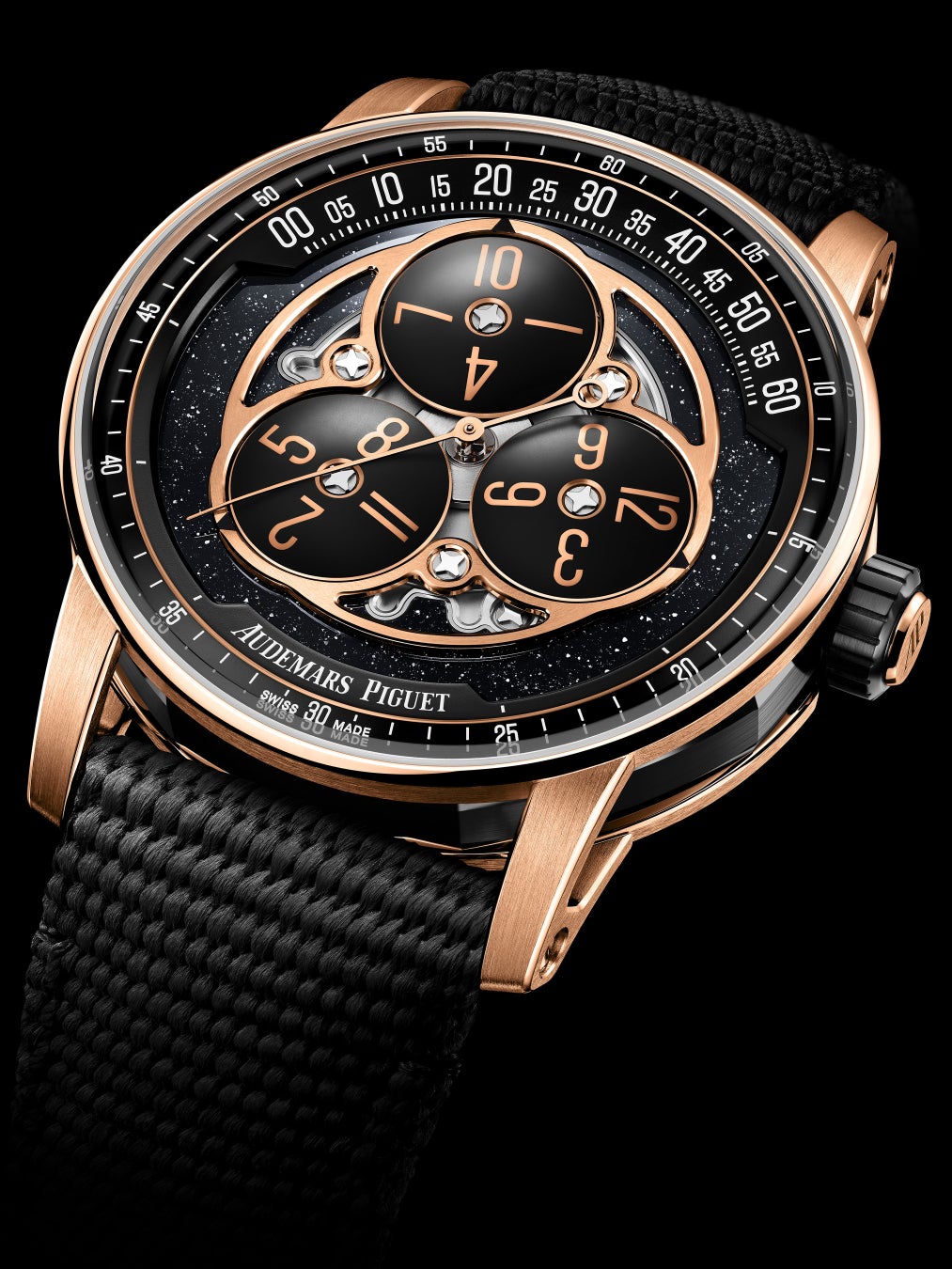 本モデルでは、18Kピンクゴールドのベゼル、ケースバックと、ブラックセラミックのミドルケースを組み合わせ、CODE 11.59 バイ オーデマ ピゲの現代的なケース構造を際立たせています。素材と色のコントラストはダイヤルにも広がり、ブラックアベンチュリンのプレートが、ヴァガボンドアワー表示に幻想的な輝きを添えます。