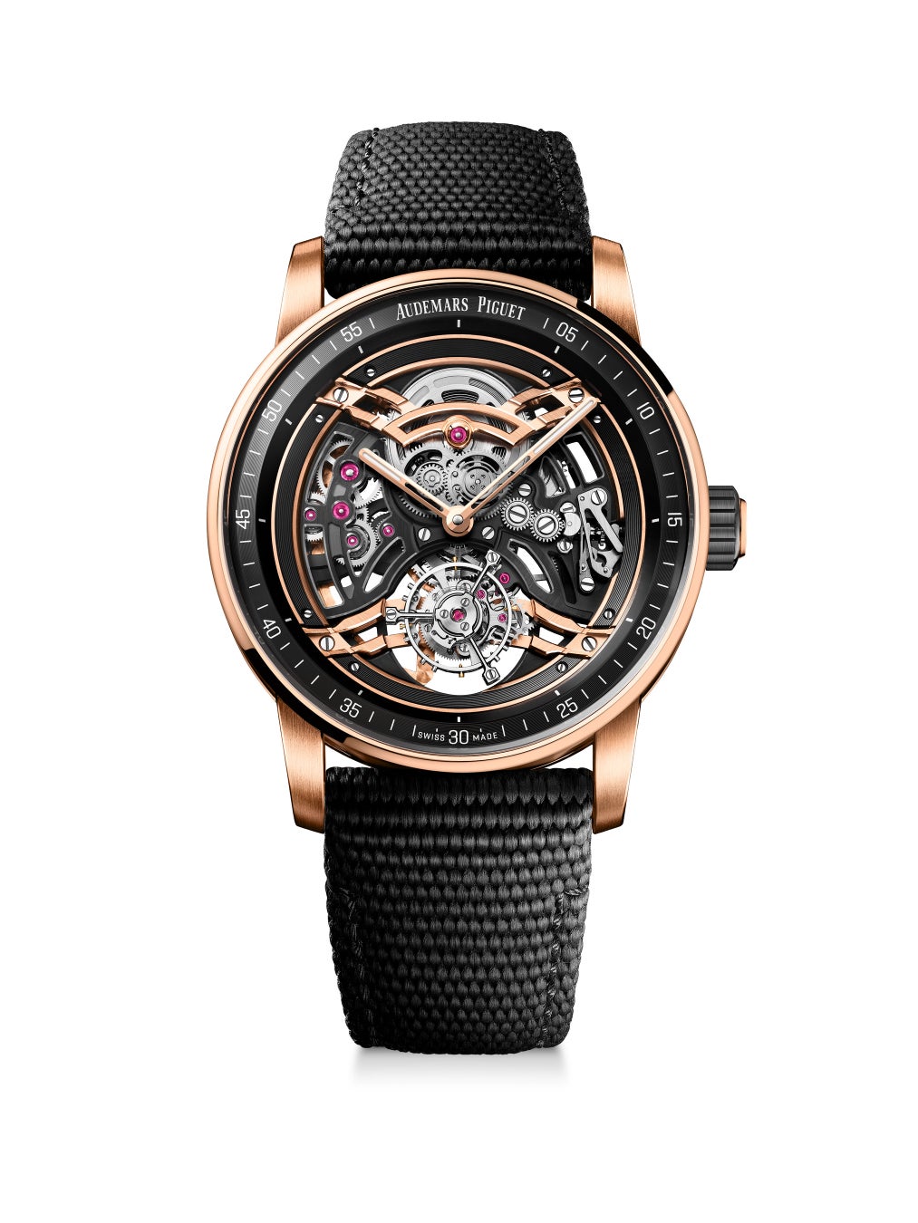 新開発の自動巻きキャリバー2980を搭載し、現代のライフスタイルにふさわしい、快適で直感的な使い心地を実現しました。新ムーブメントはオープンワークとトゥールビヨンの両分野におけるマニュファクチュールの卓越した技術を体現し、コレクションの構造的な美しさと革新性をさらなる高みへと引き上げます。ブラックセラミックと18Kピンクゴールドが織りなす大胆なツートーンのコントラストは、スケルトンムーブメントにもシームレスに反映され、奥行きと美しさを与えています。本モデルは、機械工学と伝統技術が融合した、現代オートオルロジュリーにおける、オーデマ ピゲの妥協なき時計製作へのビジョンを体現するタイムピースです。
