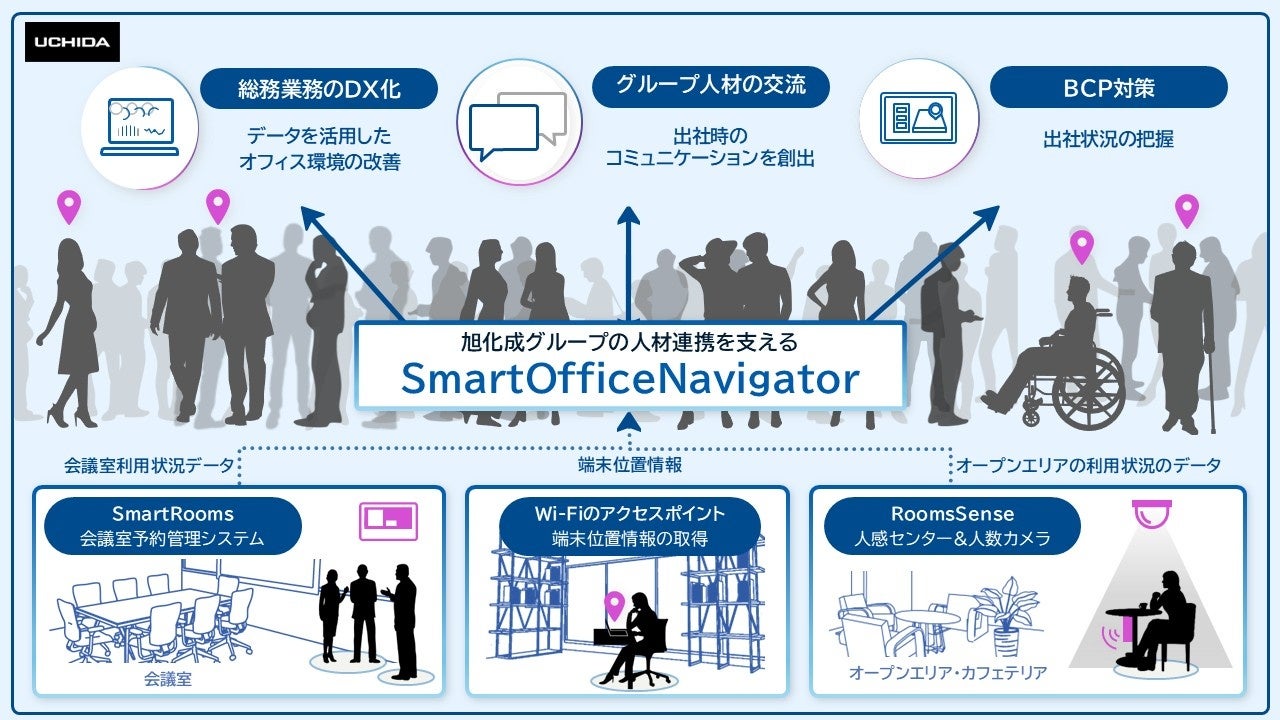 株式会社内田洋行(本社:東京都中央区、代表取締役社長:大久保昇、以下 内田洋行)は、旭化成株式会社(本社:東京都千代田区、代表取締役社長:工藤幸四郎、以下 旭化成)の本社に、人と場をつなぐシステム「SmartOfficeNavigator」を導入いたしました。本システムは、本社勤務の旭化成グループ十数社の従業員が横断的なコミュニケーションを促進するために導入されました。さらに旭化成は2025年10月以降、新たにオフィススペースの有効活用や総務部門の業務改革など、複数の観点から導入効果を高める取り組みを開始します。