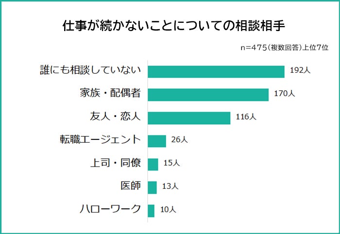 仕事が続かないことを相談する相手を聞いたところ、1位は「誰にも相談していない(192人)」でした。自分ひとりで解決しようとする人が多い一方で、「仕事が続かないことに問題を感じていないので、誰にも相談しない」という意見も複数寄せられています。「仕事が続かないことを解決したい」と考えていない人もいるとわかりました。