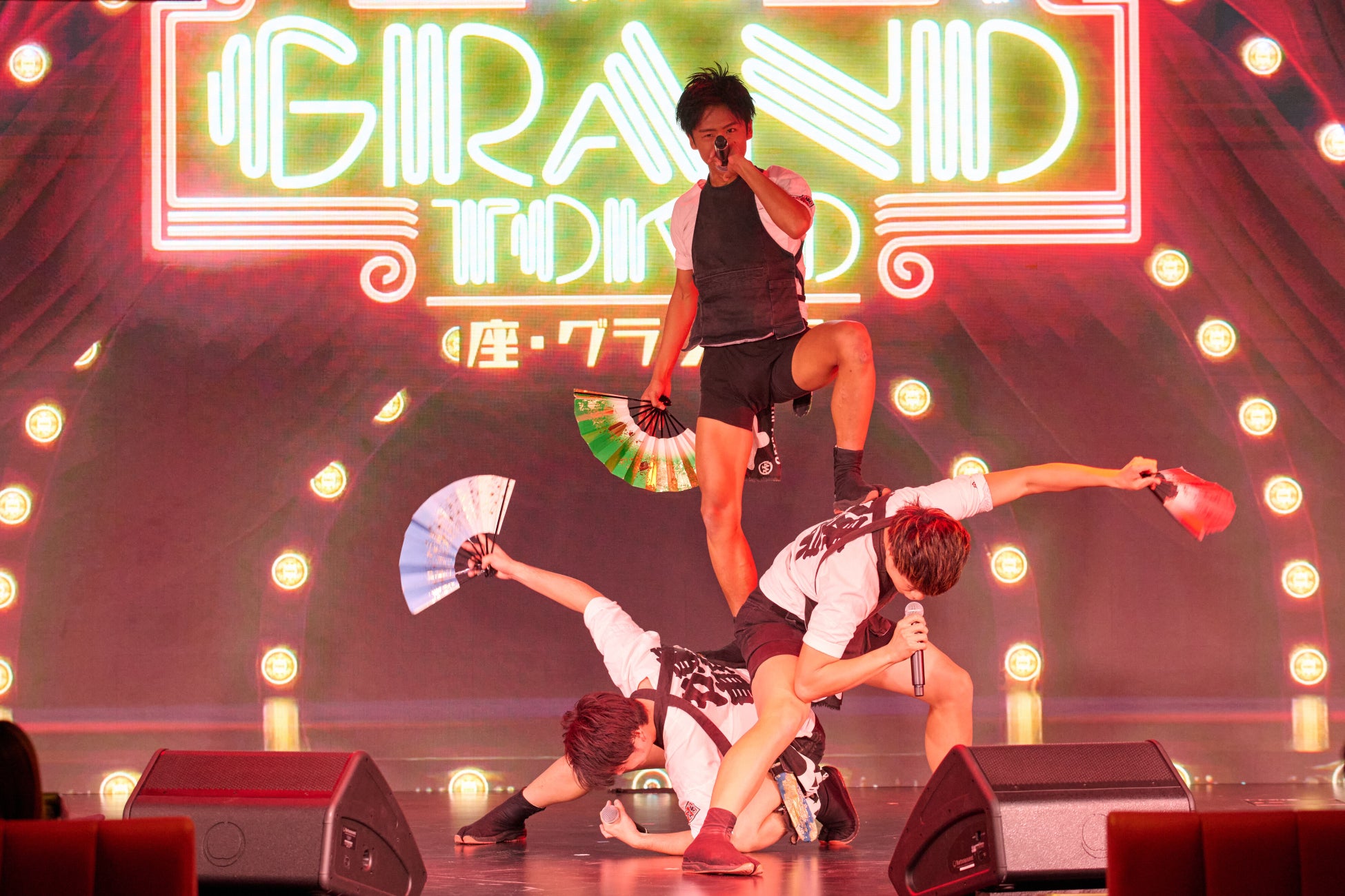 人力車をひっぱる現役俥夫(しゃふ)が結成したユニット“東京力車(とうきょうりきしゃ)”の皆さんに『和』を基調とした心を揺さぶるサウンドとアクロバティックなステージパフォーマンスをしていただきました。東京力車は、東京・浅草で人力車を引っ張る現役俥夫から結成された3人組で、古き良き時代の日本の伝統文化を、令和の今に伝えることをモットーに、“元気”と“笑顔”を届ける唯一無二のパフォーマンスユニットです。ライブでは、「天下御免の伊達男」からスタートしました。最後には今年リリースした「涙ひとしずく」を歌唱、計2曲を熱唱しました。俥夫のユニフォームでのアクロバティックなパフォーマンスに会場は大盛況。『グランハマー』で待つ人力車と俥夫への期待感がさらに上がるパフォーマンスとなりました。