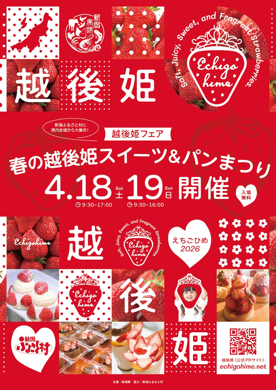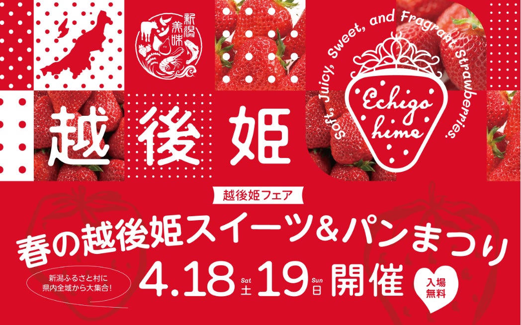 新潟県では、旬を迎えたブランドいちご「越後姫」の魅力を発信するイベント「越後姫フェア ~春の越後姫スイーツ&パンまつり~」 を開催します。
