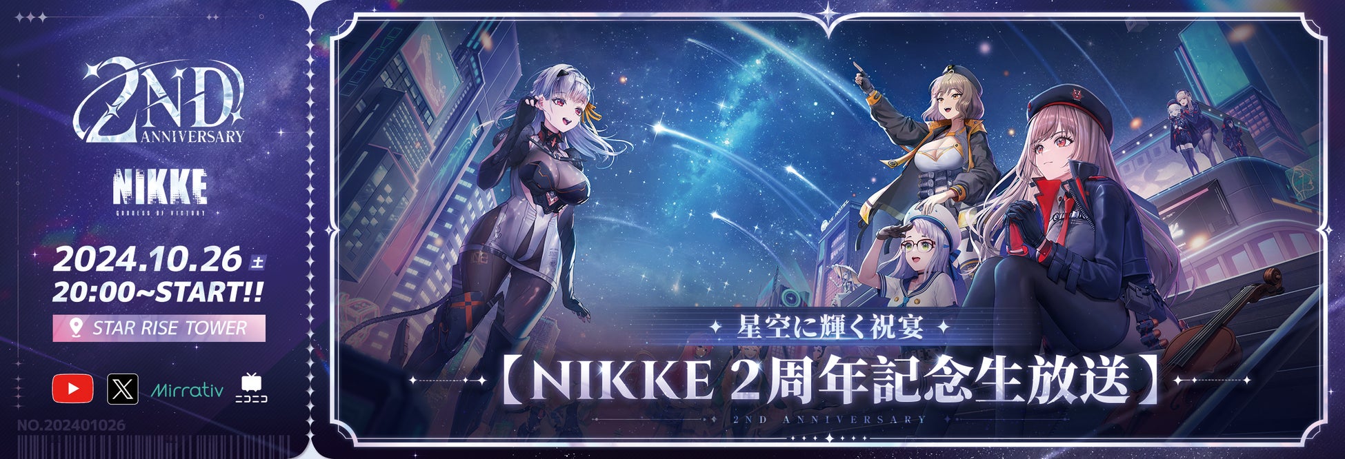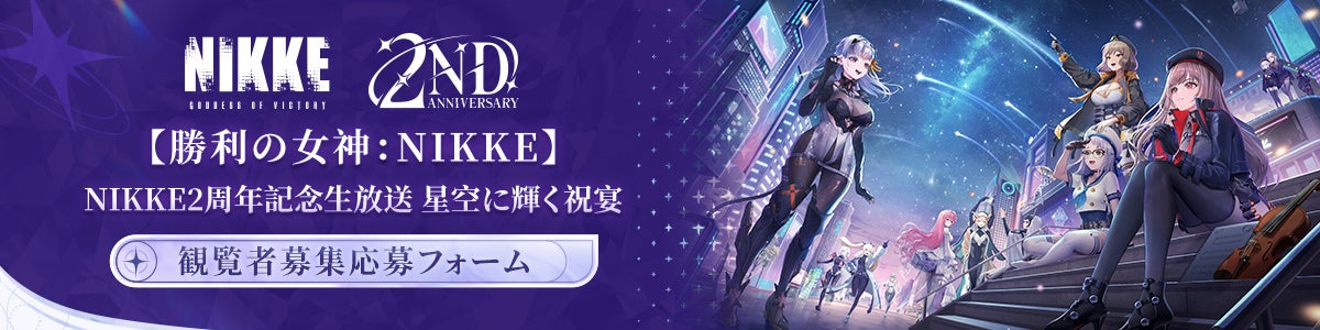 公式生放送『NIKKE 2周年記念生放送~星空に輝く祝宴~』の最新情報に加え、公式生放送に関するキャンペーンは、NIKKE公式サイト(https://nikke-jp.com/)および公式X(旧Twitter)「@NIKKE_japan」でお届けします。