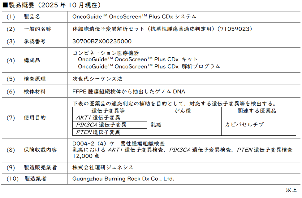 理研ジェネシス、「OncoGuide™ OncoScreen™ Plus CDxシステム」についてPIK3CA、AKT1またはPTEN遺伝子変異を有する乳癌に対するカピバセルチブのコンパニオン診断としてコンビネーション医療機器の製造販売承認を取得