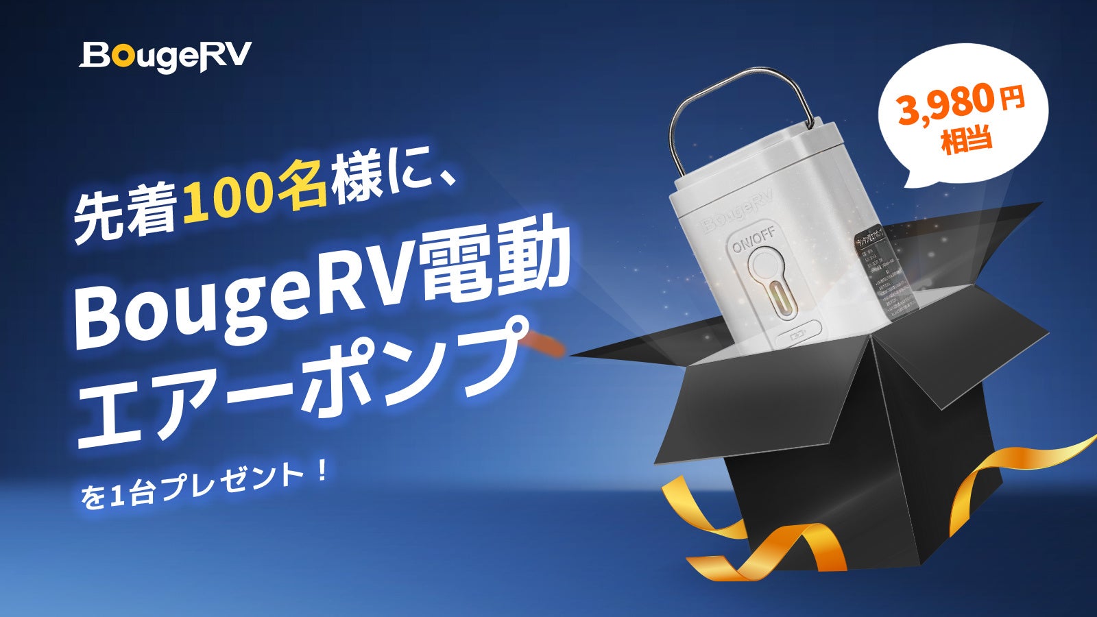 Makuakeでの先行販売において、特別なキャンペーンを実施いたします。先着100名購入者様に限り、BougeRV電動エアーポンプ(白)を1台プレゼントさせていただきます。この特典は、ご購入いただいた製品のリターン配送時に同梱してお届けいたします。ぜひ、この機会にご参加いただき、素晴らしい製品と共に便利な電動エアーポンプもお受け取りください。