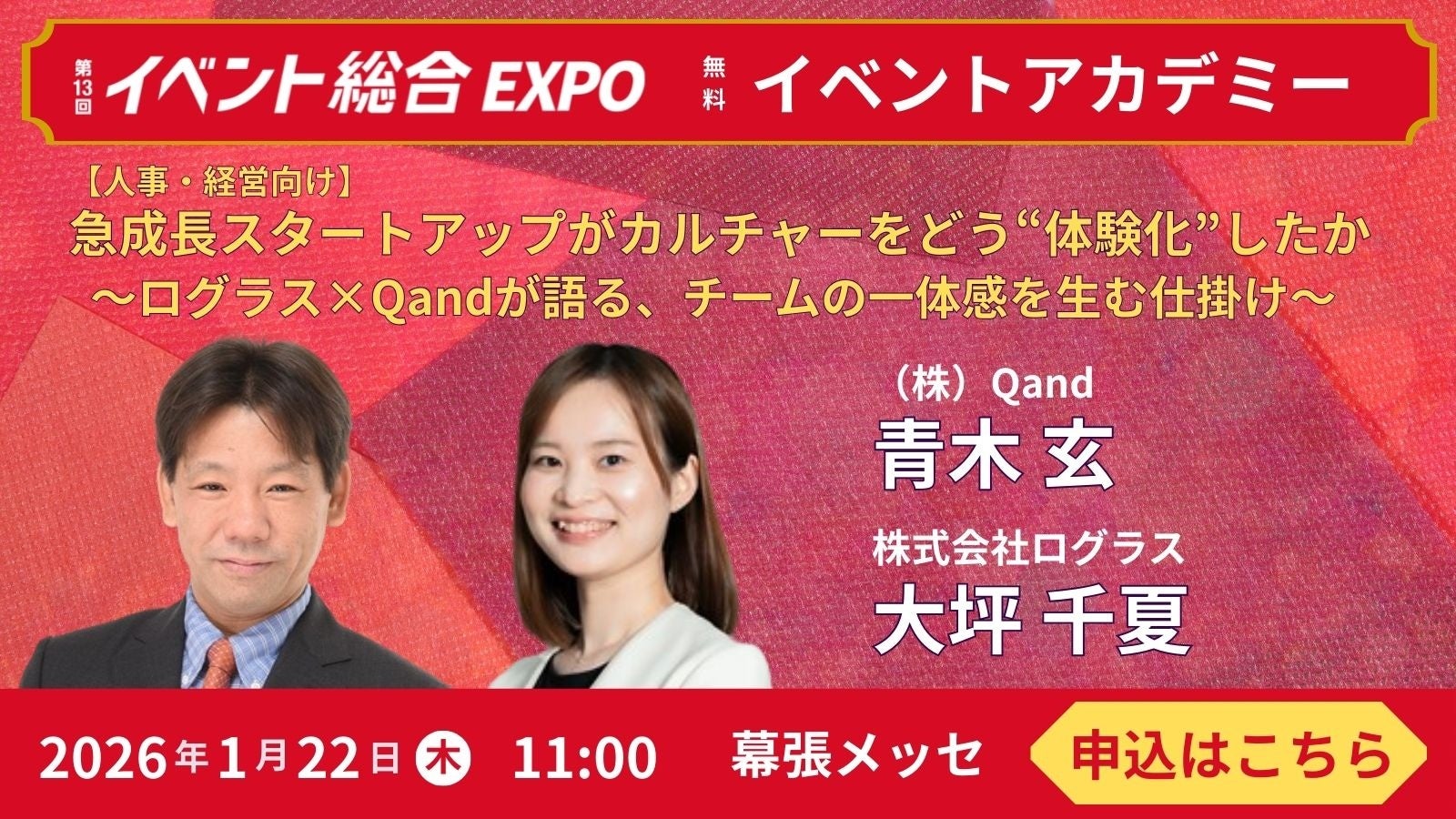 本セミナーでは、急成長スタートアップがカルチャーをどう“体験化”したか 〜ログラス×Qandが語る、チームの一体感を生む仕掛け〜と題し、急成長組織が直面する「一体感」「カルチャー浸透」の課題に、どのように向き合ったのかを具体的に紐解いていきます。