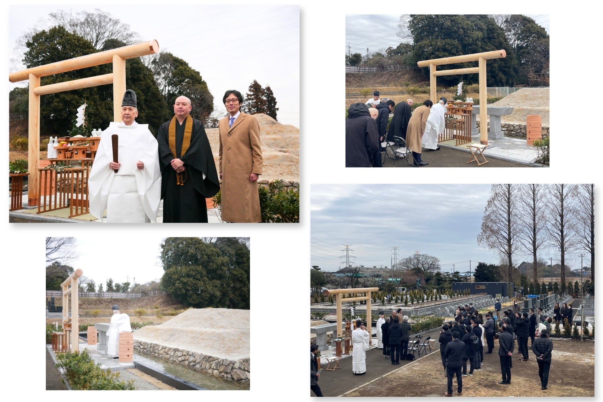 当社として1基目となる古墳墓が、千葉県野田市の野田ほたるローズガーデンに誕生しました!野田ほたるローズガーデンは正恵寺内にリニューアルオープンした、季節の花々とバラが咲き誇る美しい樹木葬霊園です。その西洋庭園のような霊園に、古墳のオーソリティである竹田恒泰が設計・開発した竹田式古墳墓の1基目がついに完成しました。先般、3月4日(火)に櫻木神社 高梨宮司の主催のもと、正恵寺 梅村住職、前方後円墳社、並びに霊園関係者が参列し、完成した古墳墓の安寧を祈念し、竣工祭を執り行いました。仏教霊園内で神道形式の儀式を執り行うのは大変珍しく、古くからの神仏習合を感じられる貴重な機会となりました。また、当古墳墓がもたらす文化の調和を象徴する式典ともなりました。