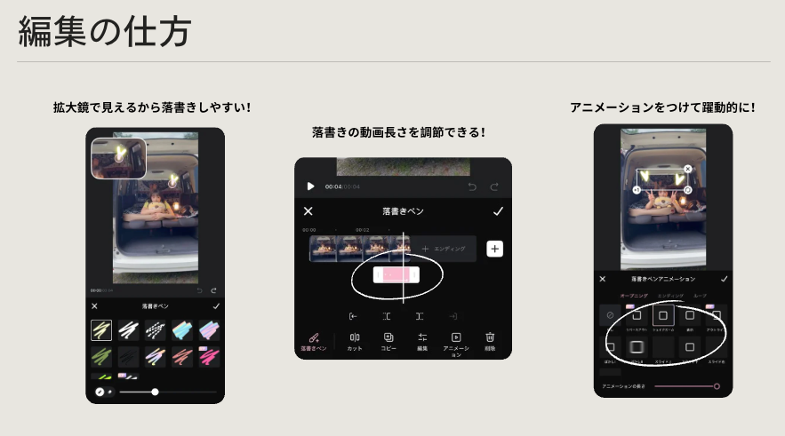 また、自分の手で描いて動画内で動かすことで、まるで “自分だけの演出” を作っているような感覚を楽しめます。動画の世界観に合わせてデザインを作り込むことで、よりオリジナリティのある作品に仕上げることができます。