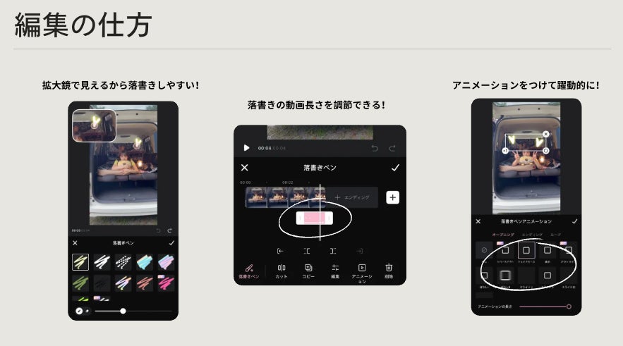 本機能により、動画編集の中で描いたイラストや文字をアニメーション化でき、これまで以上に直感的で、トレンド感のある動画制作が可能になります。
