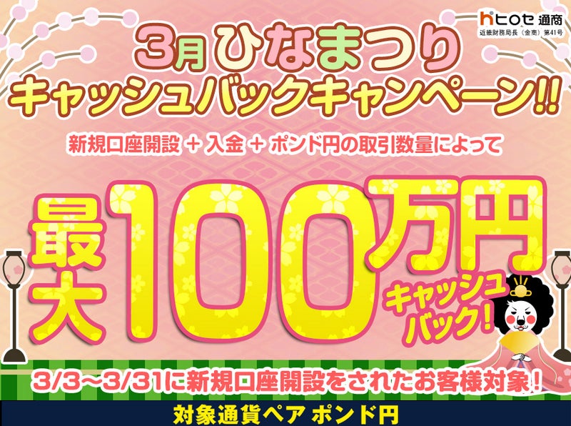 【新規口座開設限定】3月ひなまつり最大100万円キャッシュバックキャンペーン!を実施