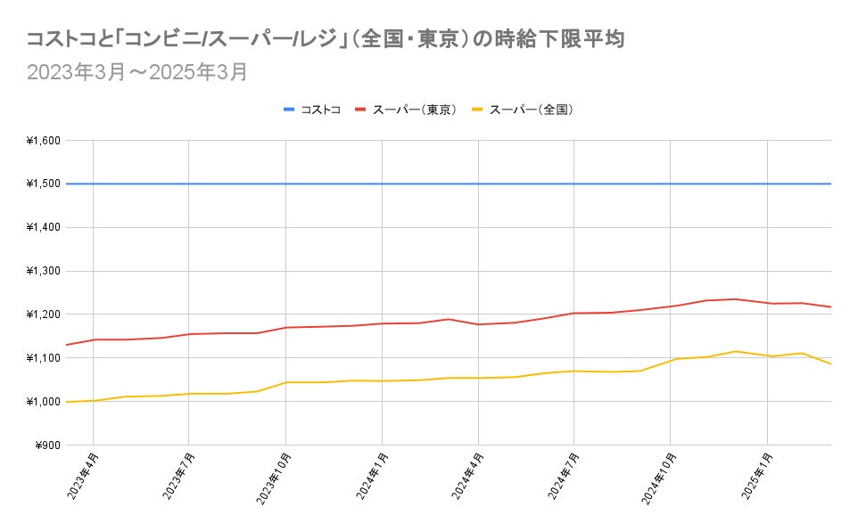 全国的にスーパーの平均時給は緩やかに上昇を続けているものの、コストコとの間には約414円の賃金ギャップがあります。全国スーパーの平均賃金が現行の上昇ペース(約+3.625円/月)を維持し、コストコが時給を引き上げなかった場合、全国スーパーの平均時給がコストコの水準である1,500円に到達するのは2025年3月から約9年半後の2034年9月頃と見込まれます。