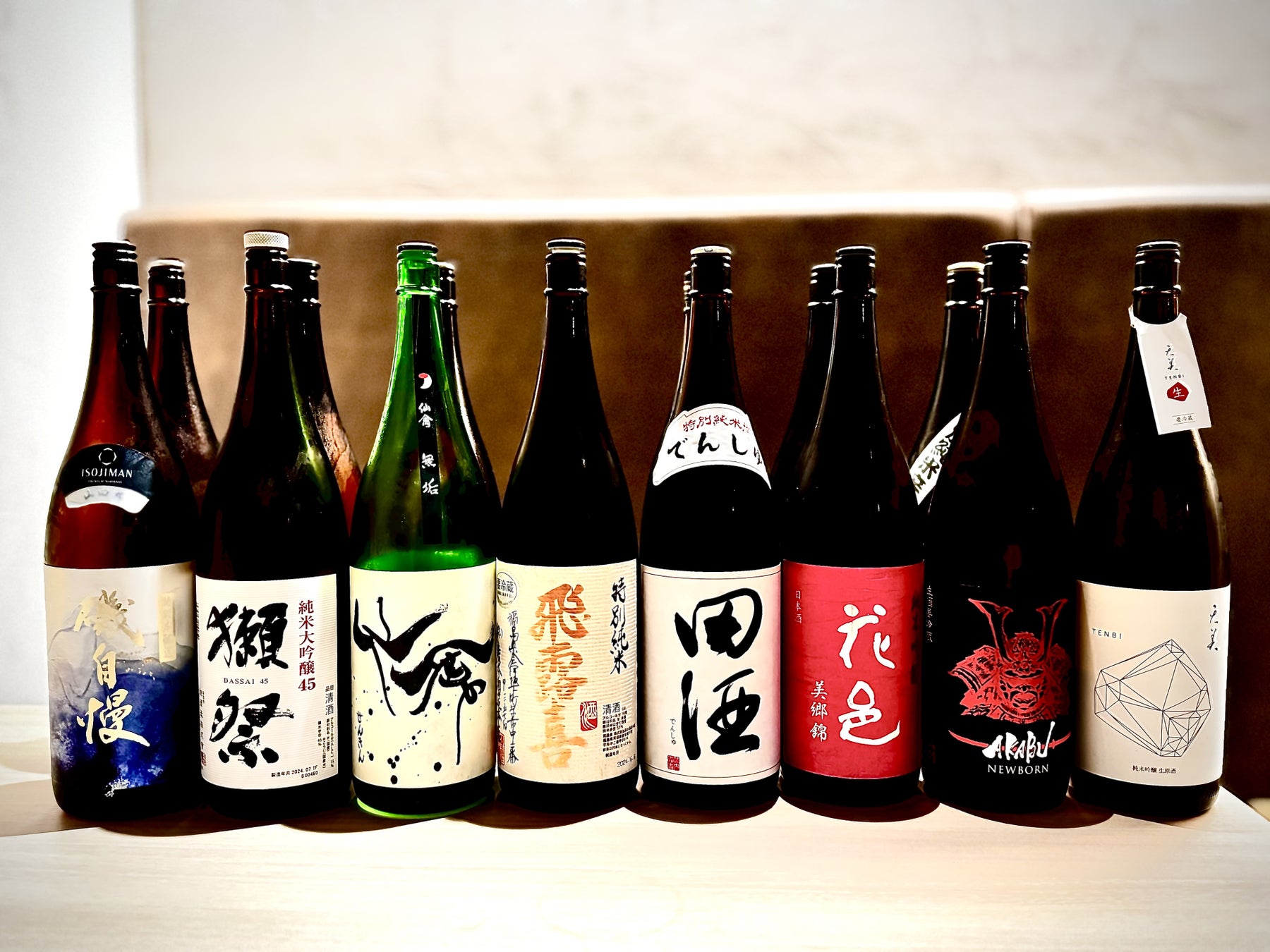 日本酒20種含む飲み放題コースは、獺祭や日高見、磯自慢、田酒など、お寿司との