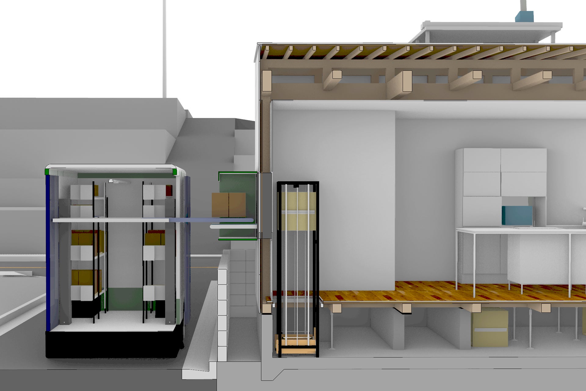 住宅デバイスの一つであるロボット床下収納は、住宅の収納力を向上するとともに、自動配送された荷物を自動で受け取り、収納する機能を担います。
