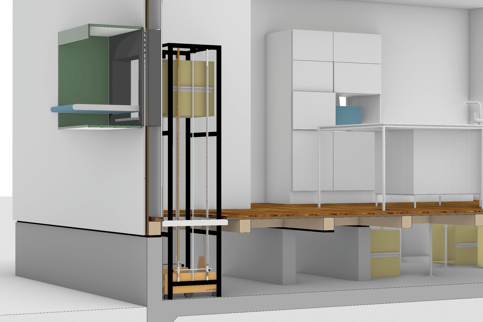 このロボット床下収納に欠かせない仕組みの一つが、本日開発パートナー募集を開始する床下エレベーターとなります。床下エレベーターは、居室と、床下の収納空間との間で荷物の昇降を行います。
