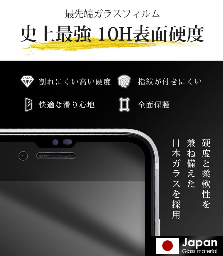 フィルムは硬度10Hを備えており、日常の使用で生じる傷や落下の衝撃にも強く、iPhoneをしっかりと保護します。長く愛用したいスマートフォンには必須のアイテムです。