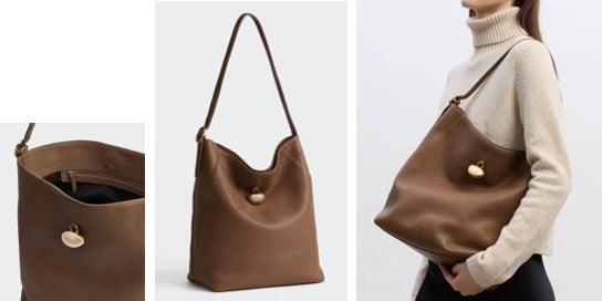 収納力の高さとモダンクラシックなデザインが魅力。大自然からインスパイアされた有機的なカーブとキュートでオリジナリティあふれるエッグ型チャームが特徴。柔らかくしなやかなイタリア製のペブルド牛革がバッグのボディに美しいドレープを生み出します。内側にはジッパー付き小物入れもあり、貴重品収納にも配慮されています。