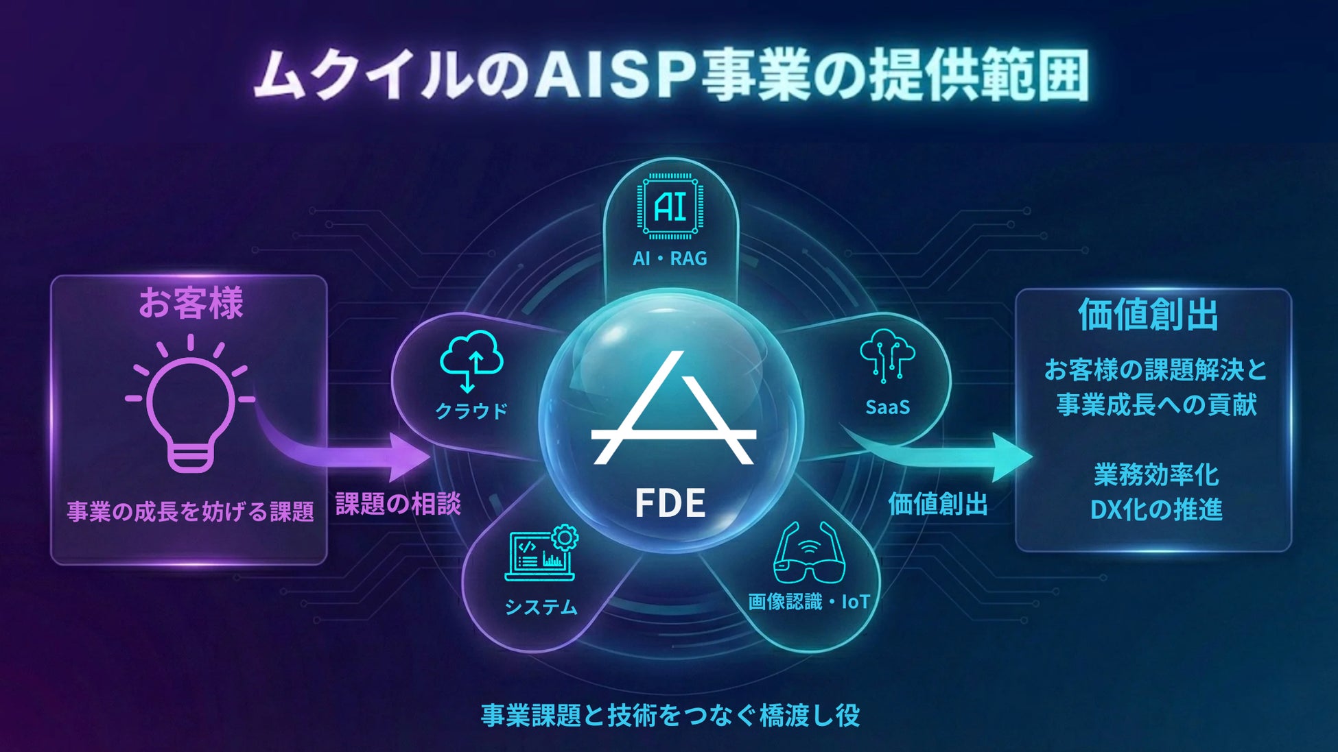 こうした状況を受け、株式会社ムクイルは、お客様の現場に入り込み、AI導入から定着まで徹底的に伴走する「AI Success Partners(AISP)事業」を立ち上げます。本事業は、海外で注目される職種 FDE(Forward Deployed Engineer) の発想を基盤とし、現場の業務理解からユースケース設計、実装、本番運用、定着支援に至るまでを一気通貫で提供することで、企業の「AI Success(AI活用の成功)」を実現することを目的としています。