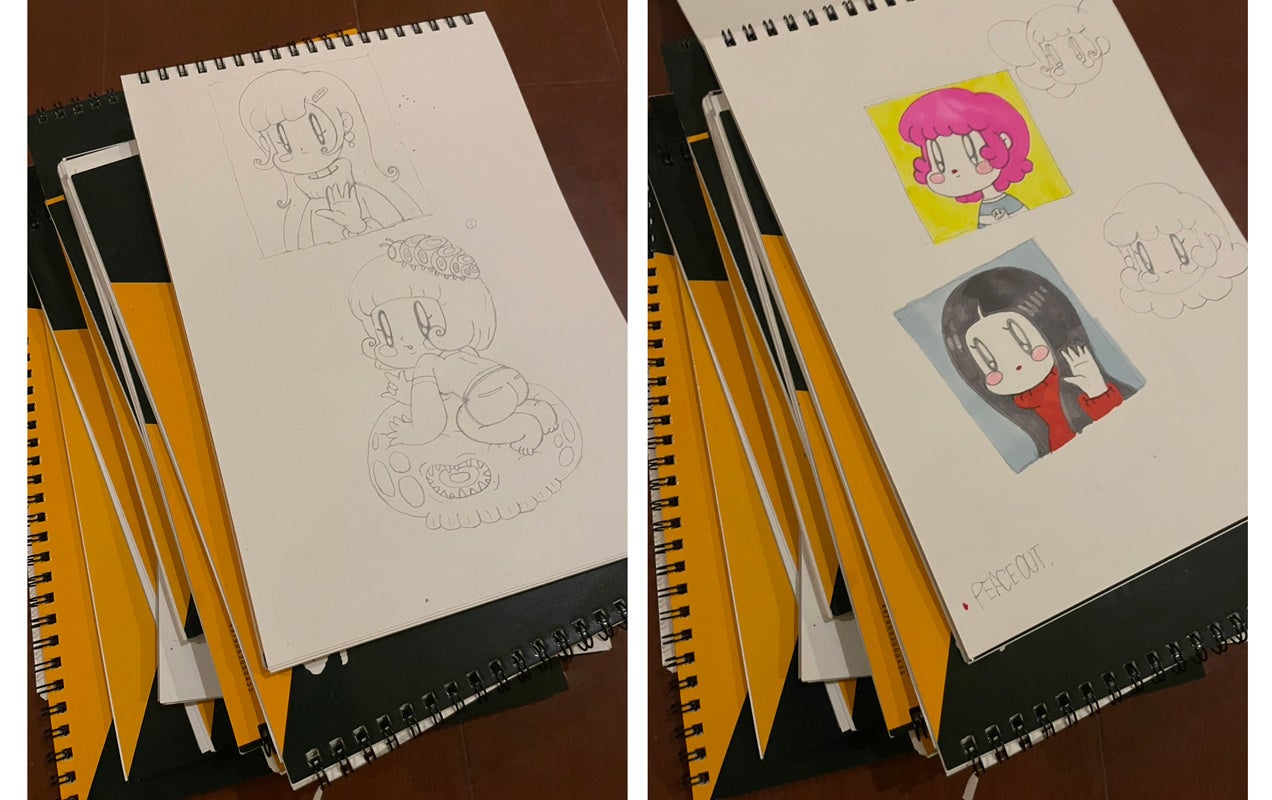 今回のギャラリー原宿の展示では、2000年代初頭から書き溜めた大量のスケッチの中から10数点の女の子の絵をセレクト、正方形の中にレイアウトし、新たにアクリル絵の具で一点物の絵を制作したシリーズを発表します。