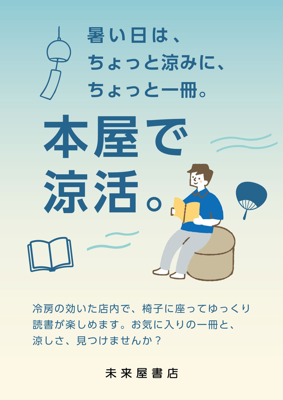 未来屋書店では、冷房の効いた心地よい空間を提供する「本屋で涼活」を通じて、本屋を単なる「買い物の場」ではなく、涼みながら心を整え、地域の人々が集える“居場所”として再定義します。