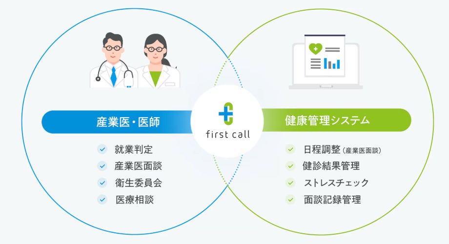 クラウド型健康管理サービス「first call」は、人とシステムの両方で、企業の健康管理をサポートします。