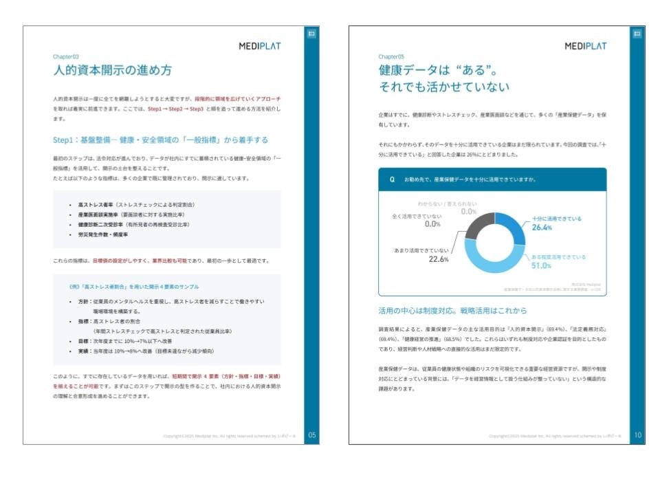 クラウド型健康管理サービス「first call」(https://service.firstcall.md/service/about )を運営する株式会社Mediplat(本社:東京都中央区、代表取締役社長:鶴 純也)は、産業保健データを活用した人的資本開示を目的にした、「人的資本開示の進め方 最初の一歩は産業保健から」を無料公開しました。