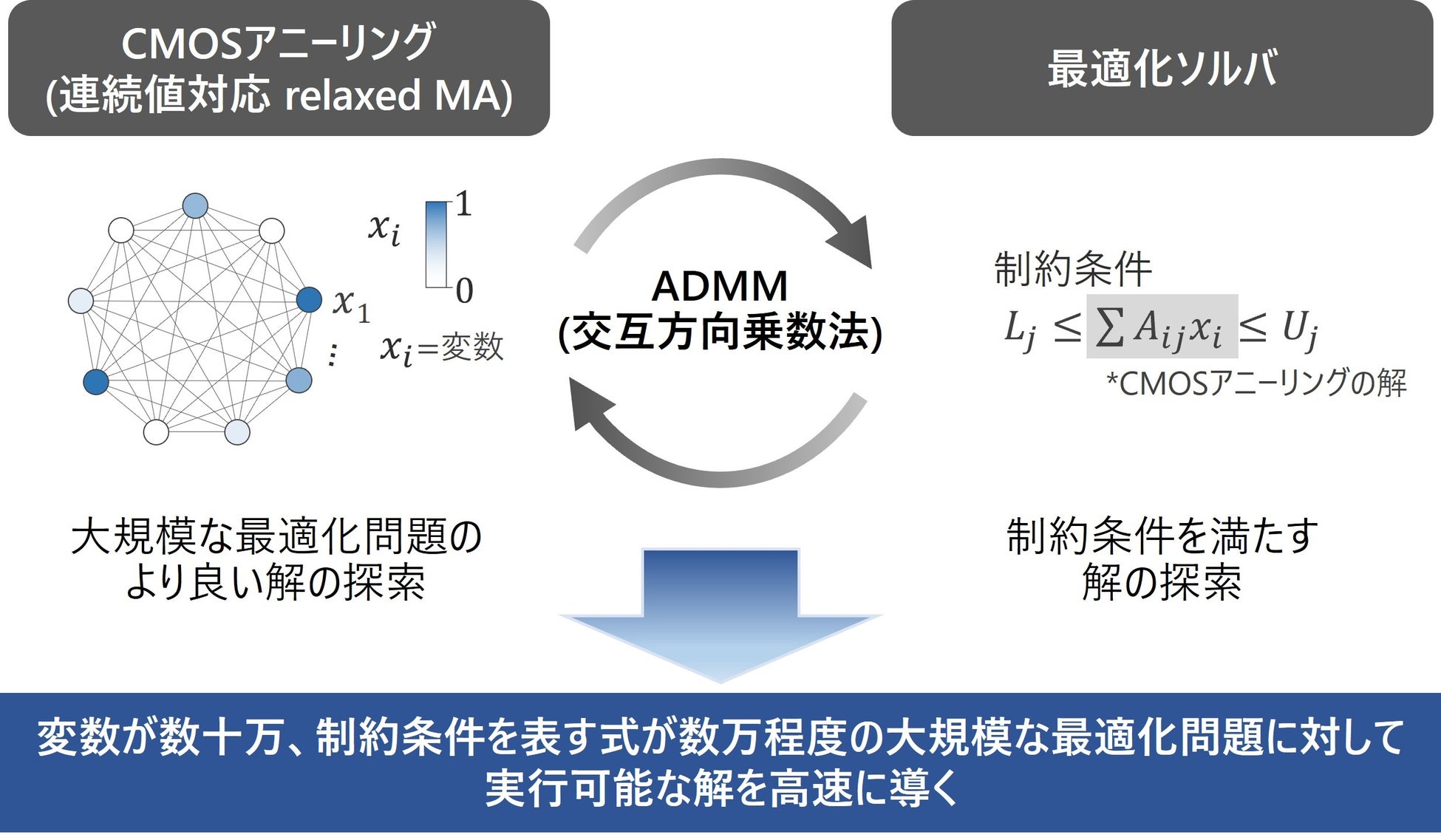 そこで、日立は、複雑な制約条件を守りながら、大規模な組合せ最適化問題を高速に解くCMOSアニーリング技術を開発しました。具体的には、CMOSアニーリングが大規模な最適化問題のより良い解を探す役割を担い、最適化ソルバがその解の周辺で制約条件を満たす解を探索する計算を繰り返すことにより、実行可能な解を高速に導き出します(図1)。CMOSアニーリングと最適化ソルバの統合には、組合せ最適化問題を分割し、解きやすい部分ごとに条件を満たす解を効率よく求めることが可能な交互方向乗数法(ADMM)を適用しました。これにより、変数が数十万、制約条件を表す式が数万程度の大規模な組合せ最適化問題を高速に解くことが可能となりました。
